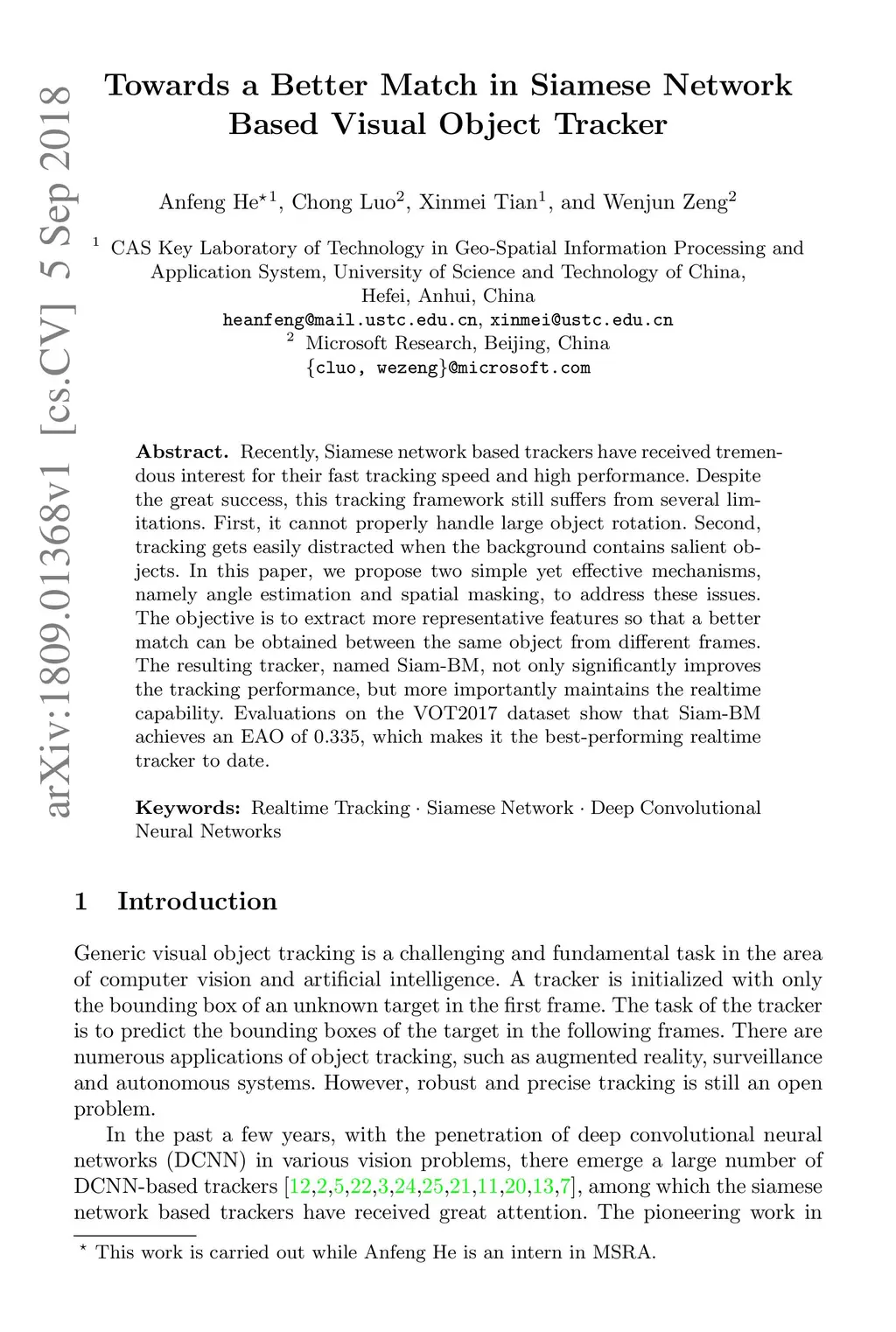 Recently, Siamese network based trackers have received tremendous interest for their fast tracking speed and high performance. Despite the great success, this tracking framework still suffers from several limitations. First, it cannot properly handle large object rotation. Second, tracking gets easily distracted when the background contains salient objects. In this paper, we propose two simple yet effective mechanisms, namely angle estimation and spatial masking, to address these issues. The objective is to extract more representative features so that a better match can be obtained between the same object from different frames. The resulting tracker, named Siam-BM, not only significantly improves the tracking performance, but more importantly maintains the realtime capability. Evaluations on the VOT2017 dataset show that Siam-BM achieves an EAO of 0.335, which makes it the best-performing realtime tracker to date.