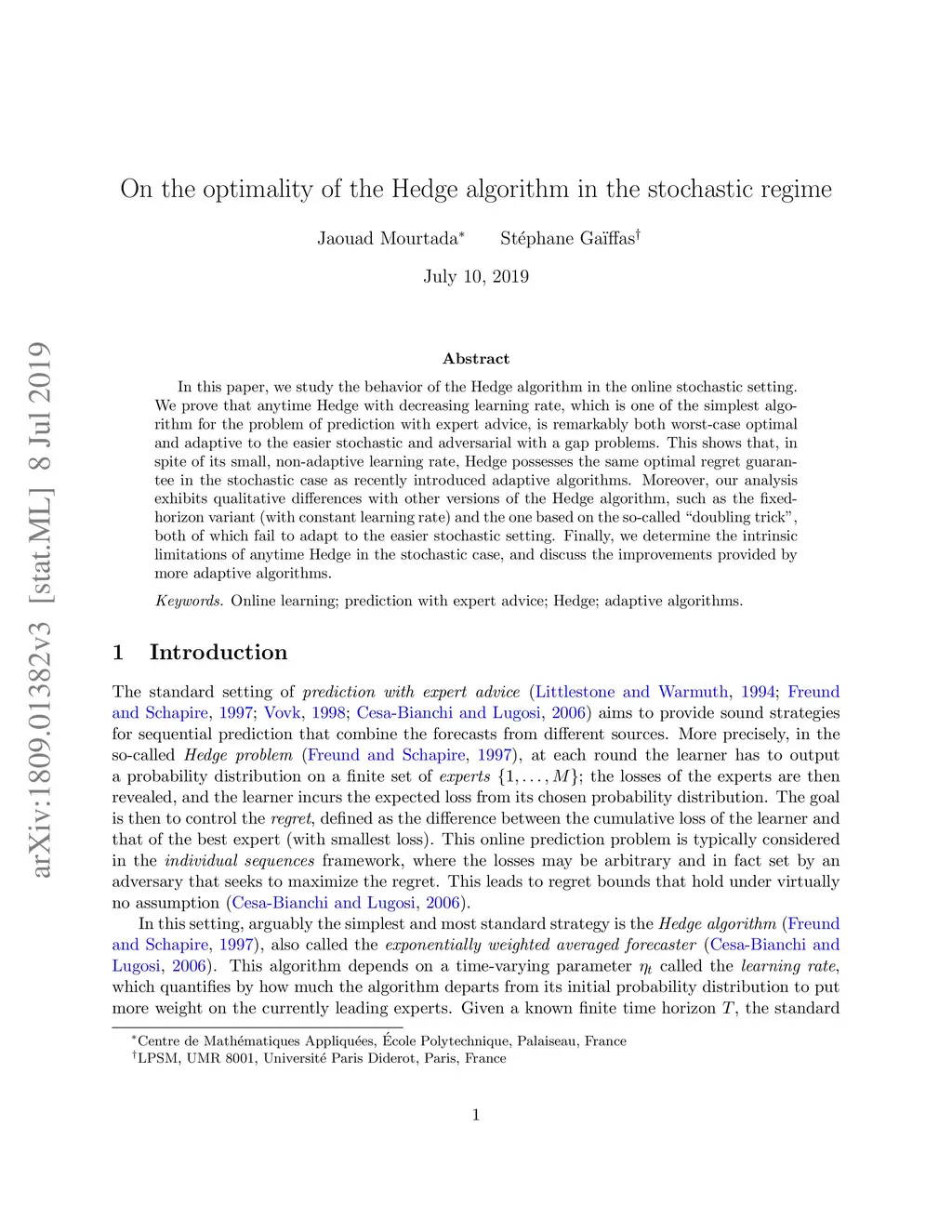 In this paper, we study the behavior of the Hedge algorithm in the online stochastic setting. We prove that anytime Hedge with decreasing learning rate, which is one of the simplest algorithm for the problem of prediction with expert advice, is surprisingly both worst-case optimal and adaptive to the easier stochastic and adversarial with a gap problems. This shows that, in spite of its small, non-adaptive learning rate, Hedge possesses the same optimal regret guarantee in the stochastic case as recently introduced adaptive algorithms. Moreover, our analysis exhibits qualitative differences with other variants of the Hedge algorithm, such as the fixed-horizon version (with constant learning rate) and the one based on the so-called "doubling trick", both of which fail to adapt to the easier stochastic setting. Finally, we discuss the limitations of anytime Hedge and the improvements provided by second-order regret bounds in the stochastic case.