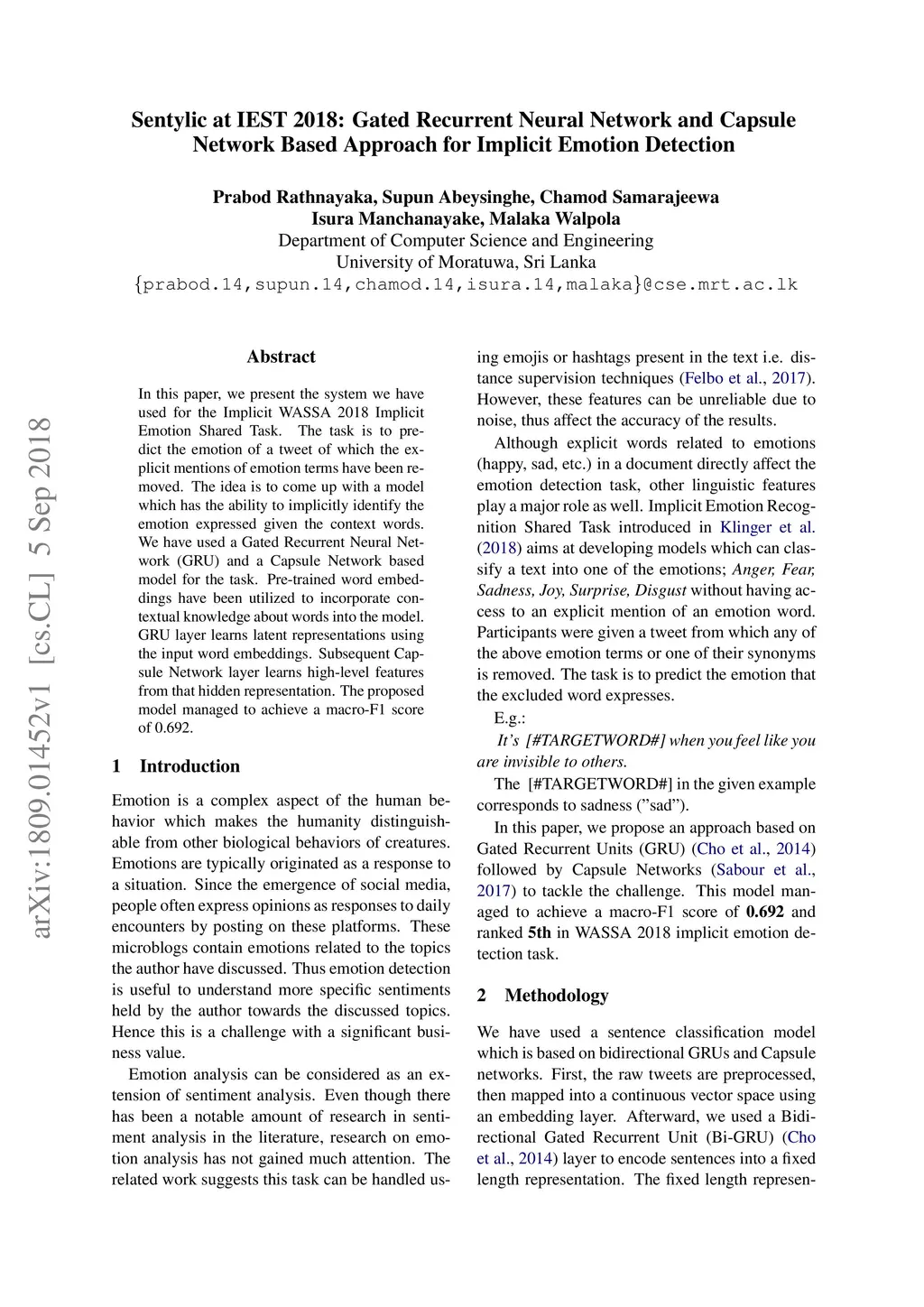 Sentylic at IEST 2018: Gated Recurrent Neural Network and Capsule