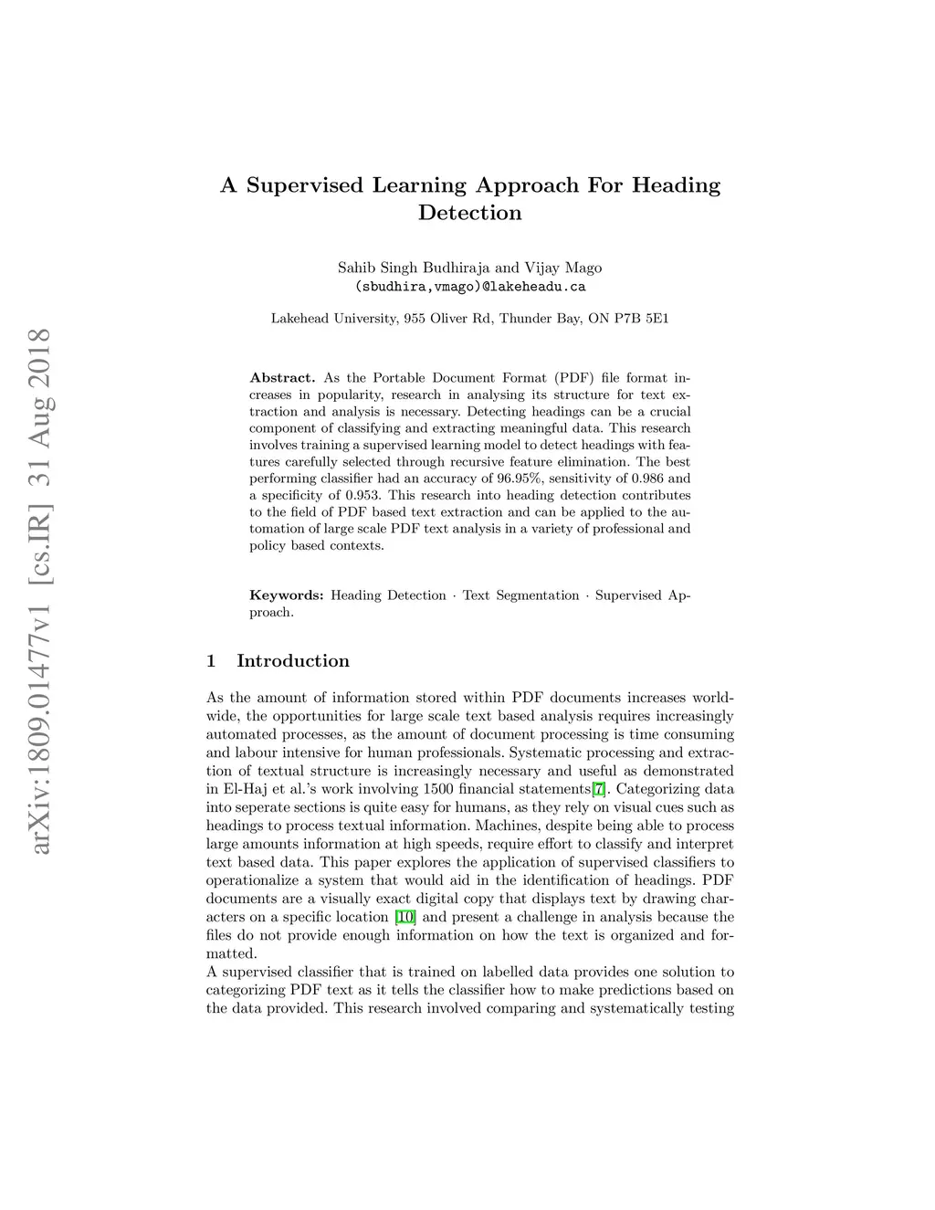 A Supervised Learning Approach For Heading Detection