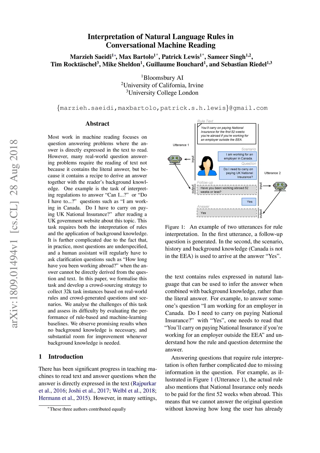 Most work in machine reading focuses on question answering problems where the answer is directly expressed in the text to read. However, many real-world question answering problems require the reading of text not because it contains the literal answer, but because it contains a recipe to derive an answer together with the reader's background knowledge. One example is the task of interpreting regulations to answer "Can I...?" or "Do I have to...?" questions such as "I am working in Canada. Do I have to carry on paying UK National Insurance?" after reading a UK government website about this topic. This task requires both the interpretation of rules and the application of background knowledge. It is further complicated due to the fact that, in practice, most questions are underspecified, and a human assistant will regularly have to ask clarification questions such as "How long have you been working abroad?" when the answer cannot be directly derived from the question and text. In this paper, we formalise this task and develop a crowd-sourcing strategy to collect 32k task instances based on real-world rules and crowd-generated questions and scenarios. We analyse the challenges of this task and assess its difficulty by evaluating the performance of rule-based and machine-learning baselines. We observe promising results when no background knowledge is necessary, and substantial room for improvement whenever background knowledge is needed.