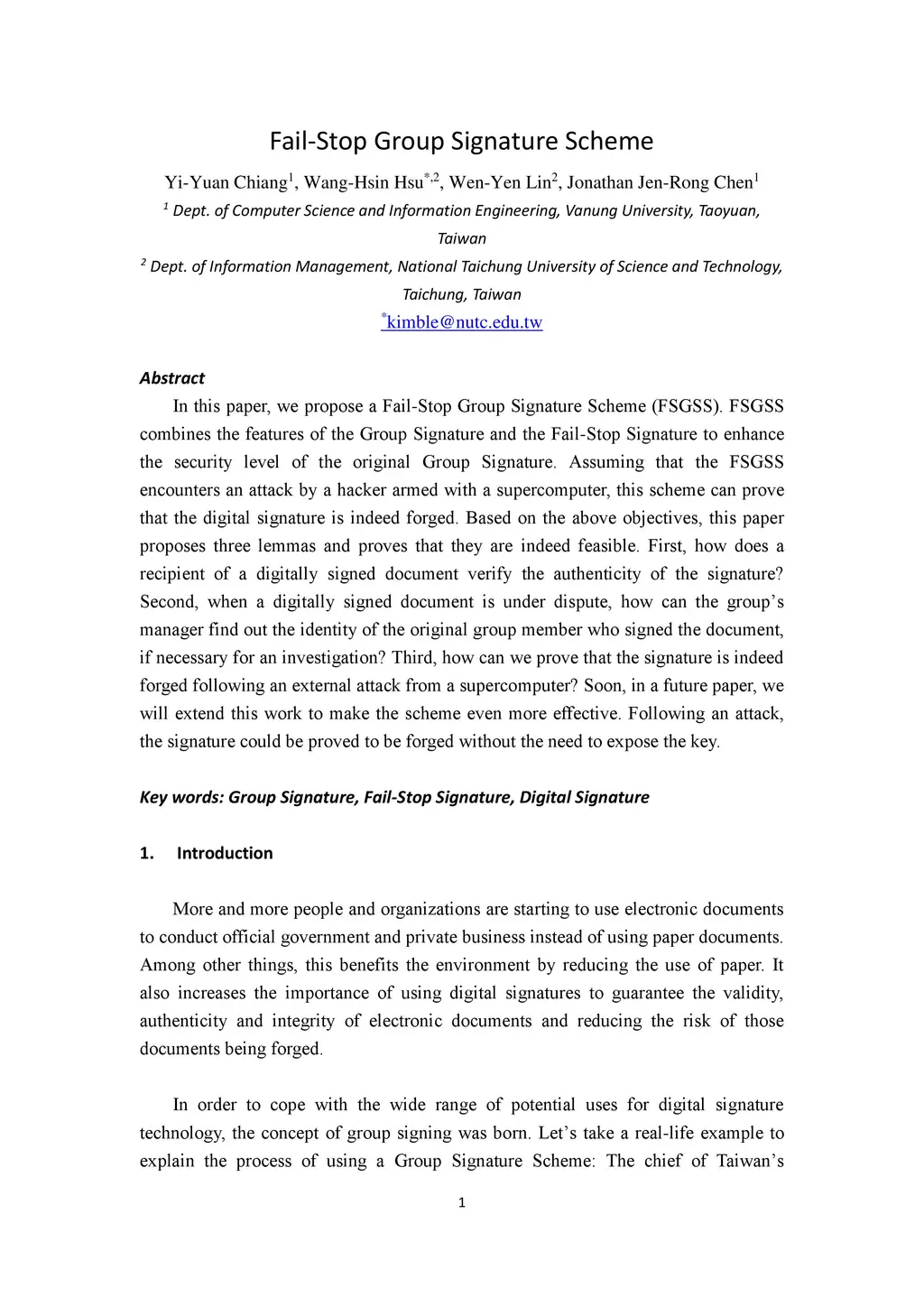In this paper, we propose a Fail-Stop Group Signature Scheme (FSGSS). FSGSS combines the features of the Group Signature and the Fail-Stop Signature to enhance the security level of the original Group Signature. Assuming that the FSGSS encounters an attack by a hacker armed with a supercomputer, this scheme can prove that the digital signature is indeed forged. Based on the above objectives, this paper proposes three lemmas and proves that they are indeed feasible. First, how does a recipient of a digitally signed document verify the authenticity of the signature? Second, when a digitally signed document is under dispute, how can the group's manager find out the identity of the original group member who signed the document, if necessary for an investigation? Third, how can we prove that the signature is indeed forged following an external attack from a supercomputer? Soon, in a future paper, we will extend this work to make the scheme even more effective. Following an attack, the signature could be proved to be forged without the need to expose the key.