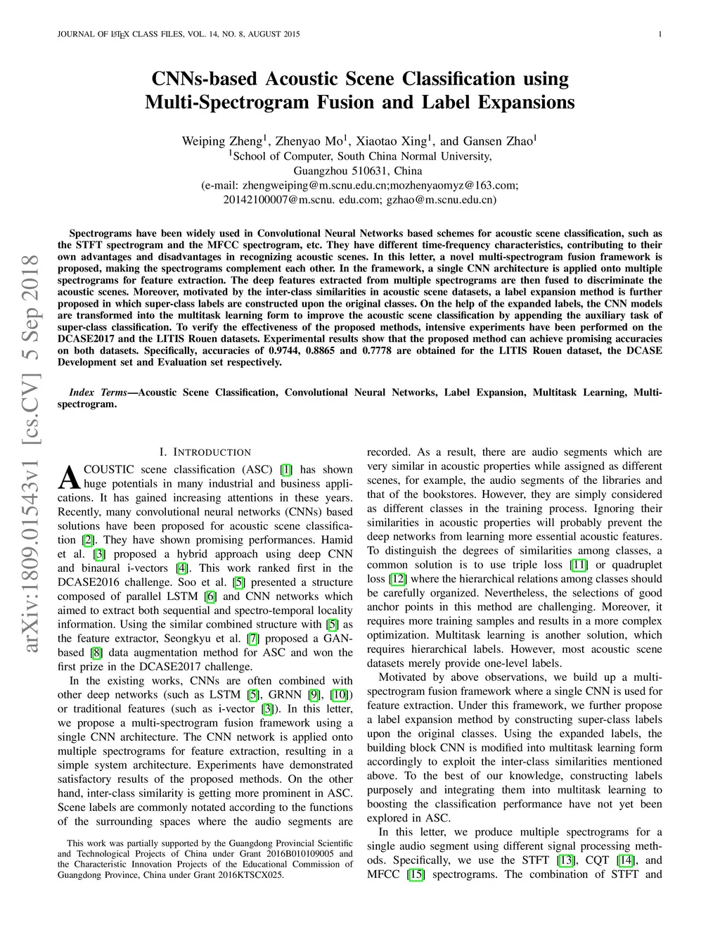 Spectrograms have been widely used in Convolutional Neural Networks based schemes for acoustic scene classification, such as the STFT spectrogram and the MFCC spectrogram, etc. They have different time-frequency characteristics, contributing to their own advantages and disadvantages in recognizing acoustic scenes. In this letter, a novel multi-spectrogram fusion framework is proposed, making the spectrograms complement each other. In the framework, a single CNN architecture is applied onto multiple spectrograms for feature extraction. The deep features extracted from multiple spectrograms are then fused to discriminate the acoustic scenes. Moreover, motivated by the inter-class similarities in acoustic scene datasets, a label expansion method is further proposed in which super-class labels are constructed upon the original classes. On the help of the expanded labels, the CNN models are transformed into the multitask learning form to improve the acoustic scene classification by appending the auxiliary task of super-class classification. To verify the effectiveness of the proposed methods, intensive experiments have been performed on the DCASE2017 and the LITIS Rouen datasets. Experimental results show that the proposed method can achieve promising accuracies on both datasets. Specifically, accuracies of 0.9744, 0.8865 and 0.7778 are obtained for the LITIS Rouen dataset, the DCASE Development set and Evaluation set respectively.