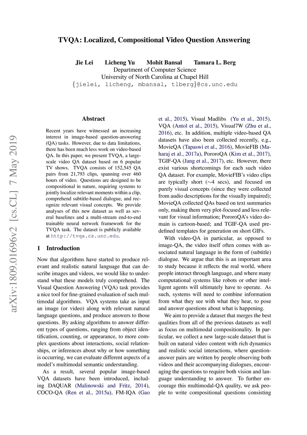 Recent years have witnessed an increasing interest in image-based question-answering (QA) tasks. However, due to data limitations, there has been much less work on video-based QA. In this paper, we present TVQA, a large-scale video QA dataset based on 6 popular TV shows. TVQA consists of 152,545 QA pairs from 21,793 clips, spanning over 460 hours of video. Questions are designed to be compositional in nature, requiring systems to jointly localize relevant moments within a clip, comprehend subtitle-based dialogue, and recognize relevant visual concepts. We provide analyses of this new dataset as well as several baselines and a multi-stream end-to-end trainable neural network framework for the TVQA task. The dataset is publicly available at http://tvqa.cs.unc.edu.