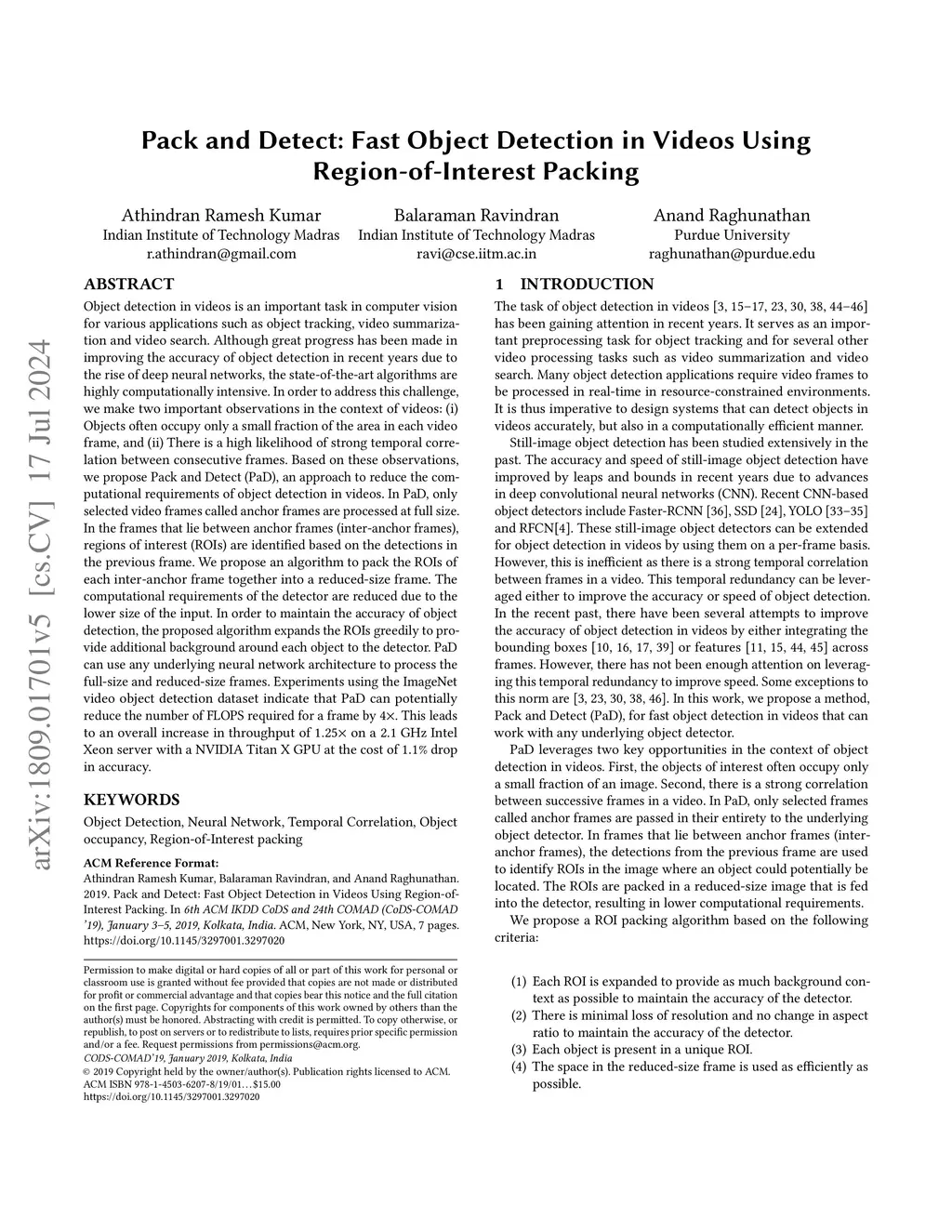 Object detection in videos is an important task in computer vision for various applications such as object tracking, video summarization and video search. Although great progress has been made in improving the accuracy of object detection in recent years due to the rise of deep neural networks, the state-of-the-art algorithms are highly computationally intensive. In order to address this challenge, we make two important observations in the context of videos: (i) Objects often occupy only a small fraction of the area in each video frame, and (ii) There is a high likelihood of strong temporal correlation between consecutive frames. Based on these observations, we propose Pack and Detect (PaD), an approach to reduce the computational requirements of object detection in videos. In PaD, only selected video frames called anchor frames are processed at full size. In the frames that lie between anchor frames (inter-anchor frames), regions of interest (ROIs) are identified based on the detections in the previous frame. We propose an algorithm to pack the ROIs of each inter-anchor frame together into a reduced-size frame. The computational requirements of the detector are reduced due to the lower size of the input. In order to maintain the accuracy of object detection, the proposed algorithm expands the ROIs greedily to provide additional background around each object to the detector. PaD can use any underlying neural network architecture to process the full-size and reduced-size frames. Experiments using the ImageNet video object detection dataset indicate that PaD can potentially reduce the number of FLOPS required for a frame by . This leads to an overall increase in throughput of on a 2.1 GHz Intel Xeon server with a NVIDIA Titan X GPU at the cost of drop in accuracy.