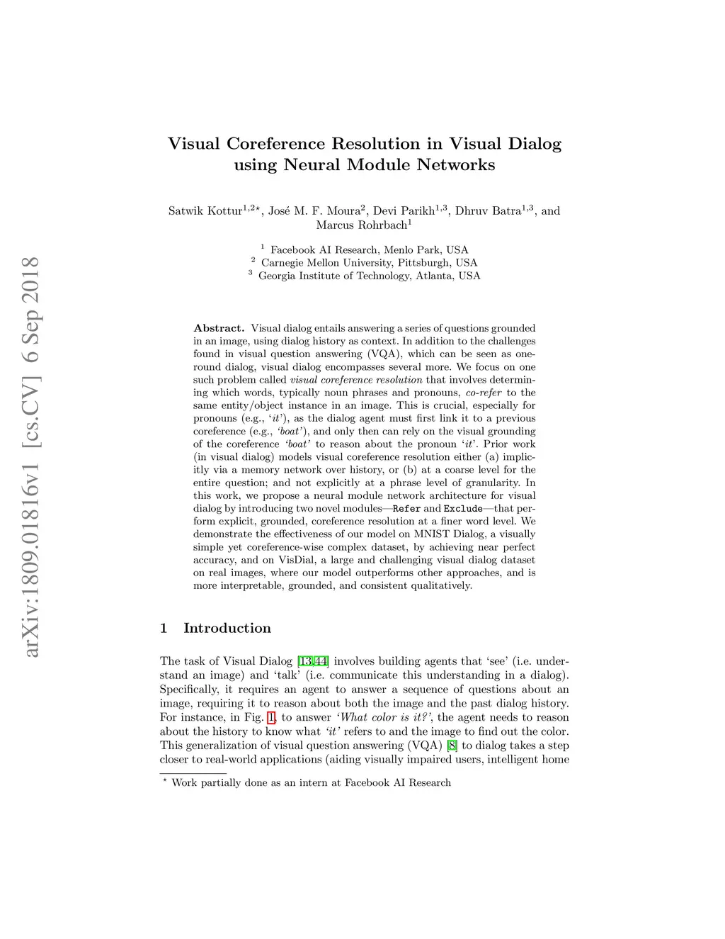 Visual dialog entails answering a series of questions grounded in an image, using dialog history as context. In addition to the challenges found in visual question answering (VQA), which can be seen as one-round dialog, visual dialog encompasses several more. We focus on one such problem called visual coreference resolution that involves determining which words, typically noun phrases and pronouns, co-refer to the same entity/object instance in an image. This is crucial, especially for pronouns (e.g., `it'), as the dialog agent must first link it to a previous coreference (e.g., `boat'), and only then can rely on the visual grounding of the coreference `boat' to reason about the pronoun `it'. Prior work (in visual dialog) models visual coreference resolution either (a) implicitly via a memory network over history, or (b) at a coarse level for the entire question; and not explicitly at a phrase level of granularity. In this work, we propose a neural module network architecture for visual dialog by introducing two novel modules - Refer and Exclude - that perform explicit, grounded, coreference resolution at a finer word level. We demonstrate the effectiveness of our model on MNIST Dialog, a visually simple yet coreference-wise complex dataset, by achieving near perfect accuracy, and on VisDial, a large and challenging visual dialog dataset on real images, where our model outperforms other approaches, and is more interpretable, grounded, and consistent qualitatively.