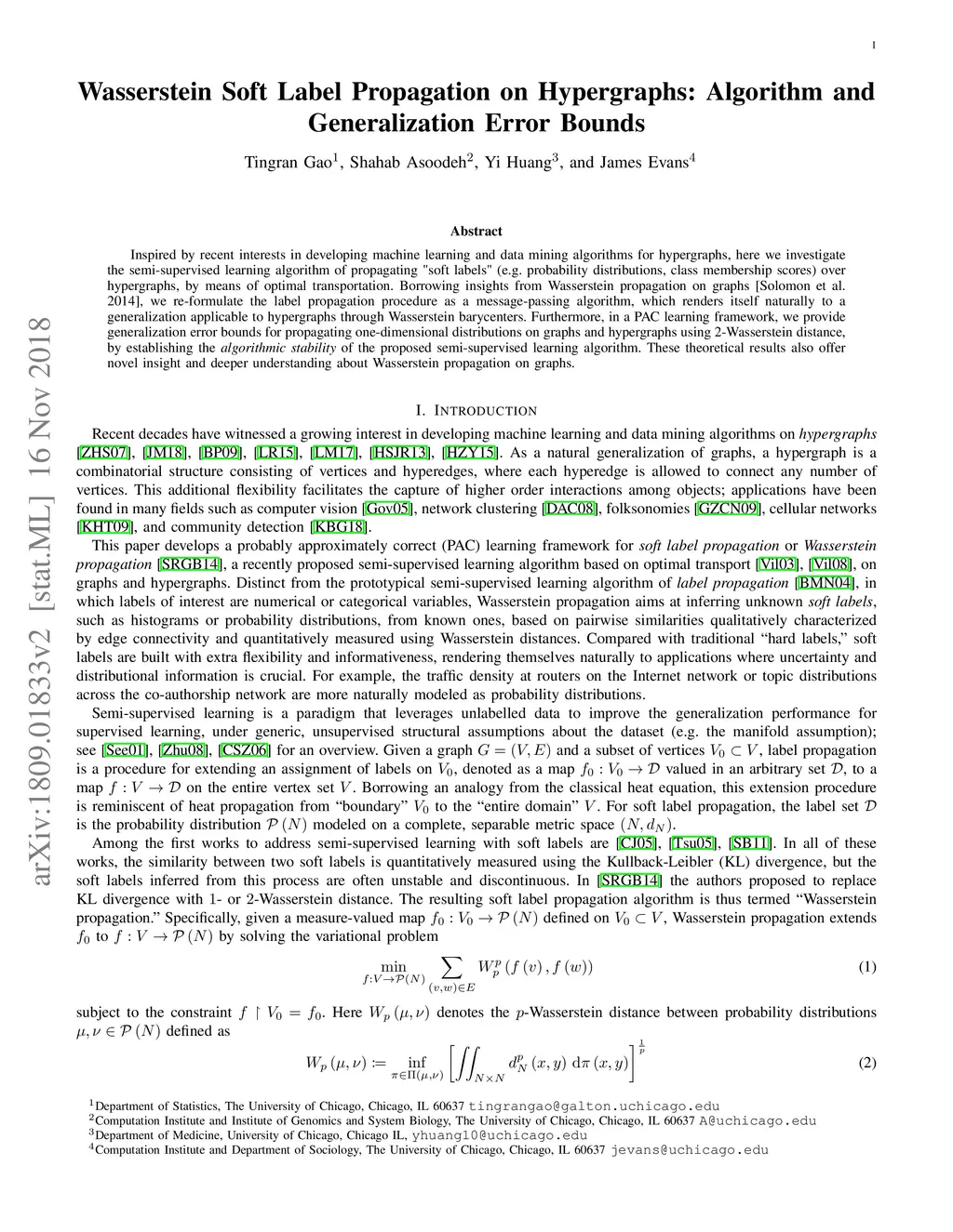 Inspired by recent interests of developing machine learning and data mining algorithms on hypergraphs, we investigate in this paper the semi-supervised learning algorithm of propagating "soft labels" (e.g. probability distributions, class membership scores) over hypergraphs, by means of optimal transportation. Borrowing insights from Wasserstein propagation on graphs [Solomon et al. 2014], we re-formulate the label propagation procedure as a message-passing algorithm, which renders itself naturally to a generalization applicable to hypergraphs through Wasserstein barycenters. Furthermore, in a PAC learning framework, we provide generalization error bounds for propagating one-dimensional distributions on graphs and hypergraphs using 2-Wasserstein distance, by establishing the \textit{algorithmic stability} of the proposed semi-supervised learning algorithm. These theoretical results also shed new lights upon deeper understandings of the Wasserstein propagation on graphs.