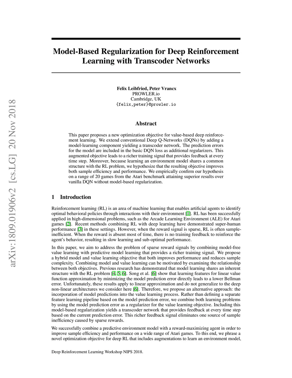 This paper proposes a new optimization objective for value-based deep reinforcement learning. We extend conventional Deep Q-Networks (DQNs) by adding a model-learning component yielding a transcoder network. The prediction errors for the model are included in the basic DQN loss as additional regularizers. This augmented objective leads to a richer training signal that provides feedback at every time step. Moreover, because learning an environment model shares a common structure with the RL problem, we hypothesize that the resulting objective improves both sample efficiency and performance. We empirically confirm our hypothesis on a range of 20 games from the Atari benchmark attaining superior results over vanilla DQN without model-based regularization.