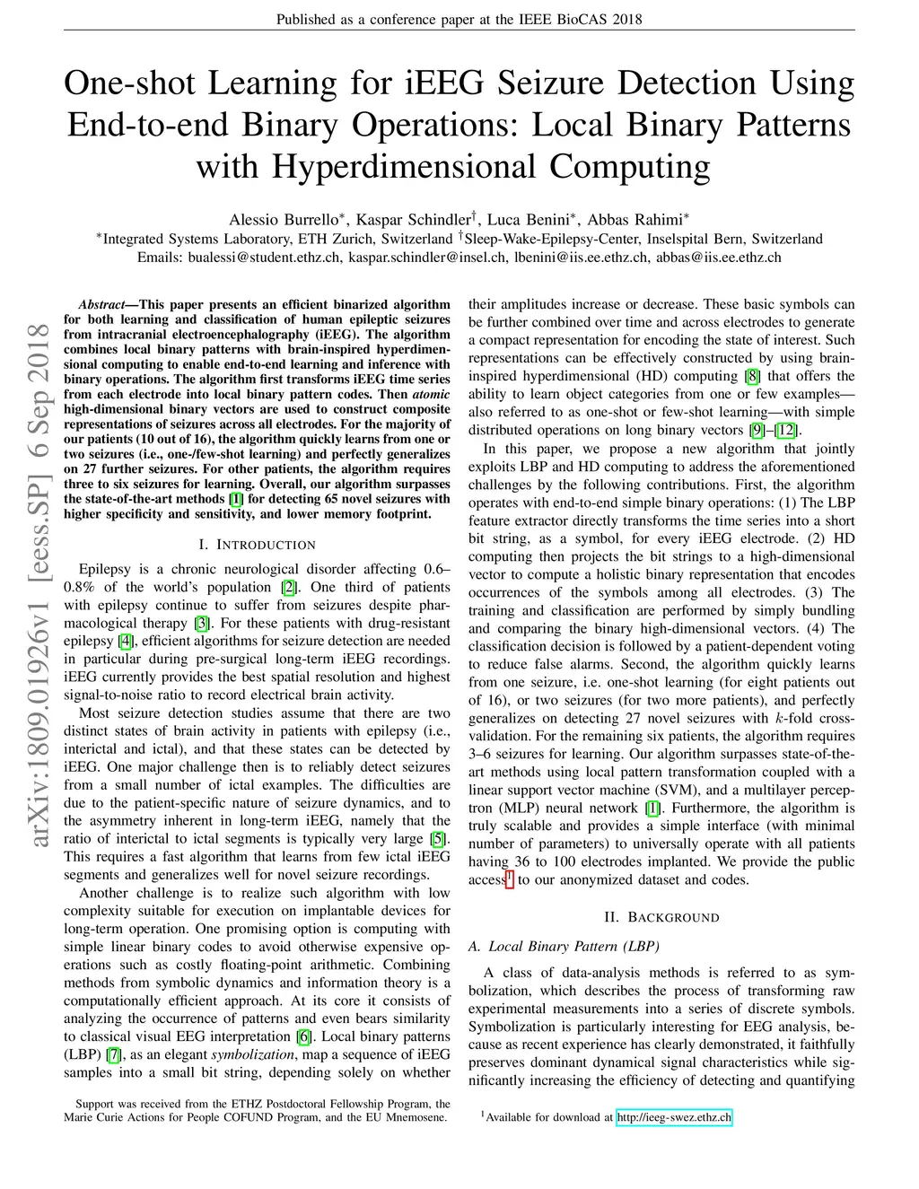 This paper presents an efficient binarized algorithm for both learning and classification of human epileptic seizures from intracranial electroencephalography (iEEG). The algorithm combines local binary patterns with brain-inspired hyperdimensional computing to enable end-to-end learning and inference with binary operations. The algorithm first transforms iEEG time series from each electrode into local binary pattern codes. Then atomic high-dimensional binary vectors are used to construct composite representations of seizures across all electrodes. For the majority of our patients (10 out of 16), the algorithm quickly learns from one or two seizures (i.e., one-/few-shot learning) and perfectly generalizes on 27 further seizures. For other patients, the algorithm requires three to six seizures for learning. Overall, our algorithm surpasses the state-of-the-art methods for detecting 65 novel seizures with higher specificity and sensitivity, and lower memory footprint.