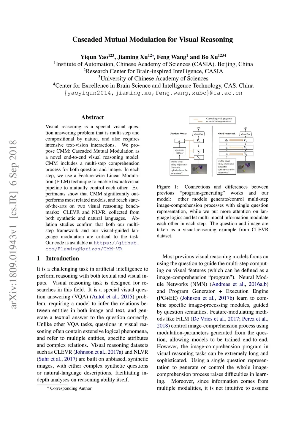 Visual reasoning is a special visual question answering problem that is multi-step and compositional by nature, and also requires intensive text-vision interactions. We propose CMM: Cascaded Mutual Modulation as a novel end-to-end visual reasoning model. CMM includes a multi-step comprehension process for both question and image. In each step, we use a Feature-wise Linear Modulation (FiLM) technique to enable textual/visual pipeline to mutually control each other. Experiments show that CMM significantly outperforms most related models, and reach state-of-the-arts on two visual reasoning benchmarks: CLEVR and NLVR, collected from both synthetic and natural languages. Ablation studies confirm that both our multistep framework and our visual-guided language modulation are critical to the task. Our code is available at https://github.com/FlamingHorizon/CMM-VR.