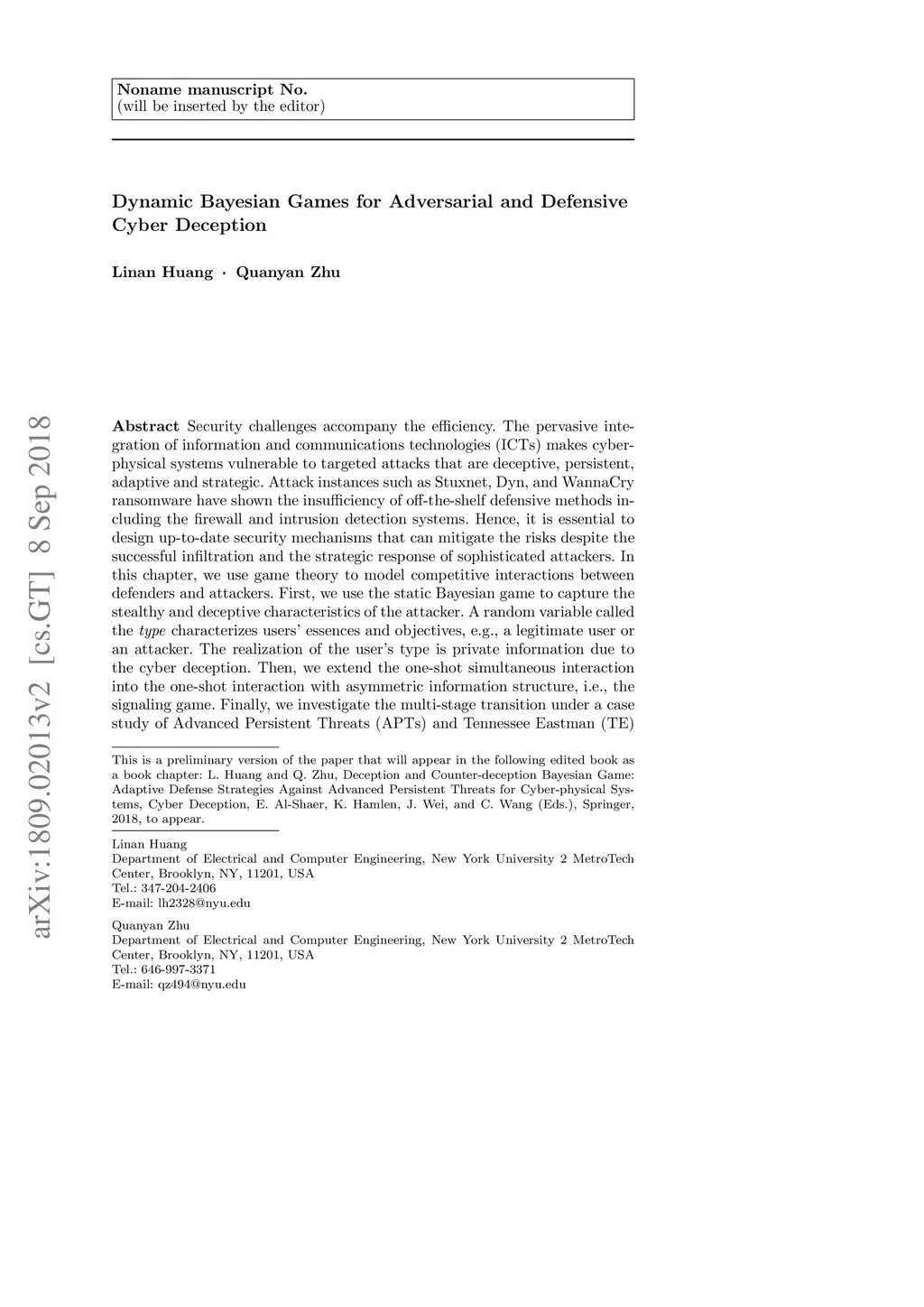 Dynamic Bayesian Games for Adversarial and Defensive Cyber Deception