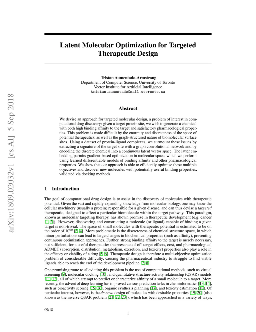 We devise an approach for targeted molecular design, a problem of interest in computational drug discovery: given a target protein site, we wish to generate a chemical with both high binding affinity to the target and satisfactory pharmacological properties. This problem is made difficult by the enormity and discreteness of the space of potential therapeutics, as well as the graph-structured nature of biomolecular surface sites. Using a dataset of protein-ligand complexes, we surmount these issues by extracting a signature of the target site with a graph convolutional network and by encoding the discrete chemical into a continuous latent vector space. The latter embedding permits gradient-based optimization in molecular space, which we perform using learned differentiable models of binding affinity and other pharmacological properties. We show that our approach is able to efficiently optimize these multiple objectives and discover new molecules with potentially useful binding properties, validated via docking methods.