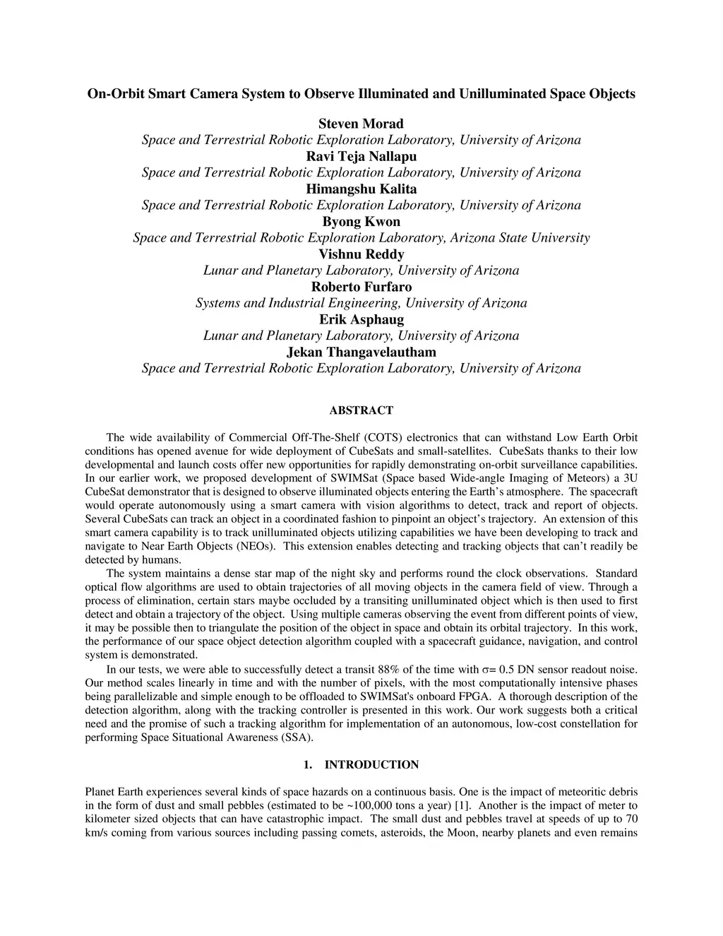 The wide availability of Commercial Off-The-Shelf (COTS) electronics that can withstand Low Earth Orbit conditions has opened avenue for wide deployment of CubeSats and small-satellites. CubeSats thanks to their low developmental and launch costs offer new opportunities for rapidly demonstrating on-orbit surveillance capabilities. In our earlier work, we proposed development of SWIMSat (Space based Wide-angle Imaging of Meteors) a 3U CubeSat demonstrator that is designed to observe illuminated objects entering the Earth's atmosphere. The spacecraft would operate autonomously using a smart camera with vision algorithms to detect, track and report of objects. Several CubeSats can track an object in a coordinated fashion to pinpoint an object's trajectory. An extension of this smart camera capability is to track unilluminated objects utilizing capabilities we have been developing to track and navigate to Near Earth Objects (NEOs). This extension enables detecting and tracking objects that can't readily be detected by humans. The system maintains a dense star map of the night sky and performs round the clock observations. Standard optical flow algorithms are used to obtain trajectories of all moving objects in the camera field of view. Through a process of elimination, certain stars maybe occluded by a transiting unilluminated object which is then used to first detect and obtain a trajectory of the object. Using multiple cameras observing the event from different points of view, it may be possible then to triangulate the position of the object in space and obtain its orbital trajectory. In this work, the performance of our space object detection algorithm coupled with a spacecraft guidance, navigation, and control system is demonstrated.