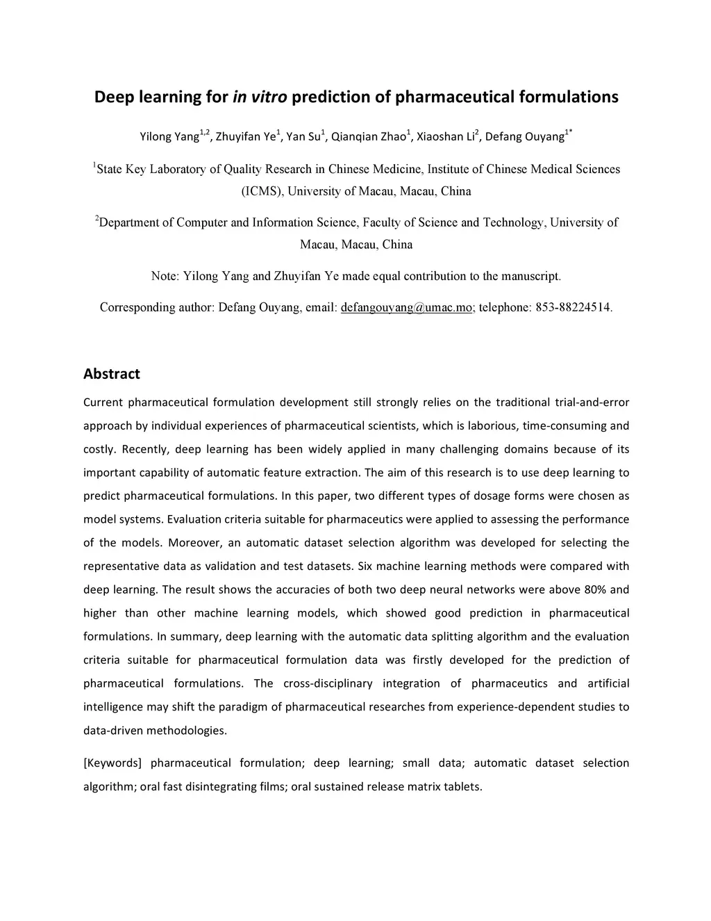 Current pharmaceutical formulation development still strongly relies on the traditional trial-and-error approach by individual experiences of pharmaceutical scientists, which is laborious, time-consuming and costly. Recently, deep learning has been widely applied in many challenging domains because of its important capability of automatic feature extraction. The aim of this research is to use deep learning to predict pharmaceutical formulations. In this paper, two different types of dosage forms were chosen as model systems. Evaluation criteria suitable for pharmaceutics were applied to assessing the performance of the models. Moreover, an automatic dataset selection algorithm was developed for selecting the representative data as validation and test datasets. Six machine learning methods were compared with deep learning. The result shows the accuracies of both two deep neural networks were above 80% and higher than other machine learning models, which showed good prediction in pharmaceutical formulations. In summary, deep learning with the automatic data splitting algorithm and the evaluation criteria suitable for pharmaceutical formulation data was firstly developed for the prediction of pharmaceutical formulations. The cross-disciplinary integration of pharmaceutics and artificial intelligence may shift the paradigm of pharmaceutical researches from experience-dependent studies to data-driven methodologies.