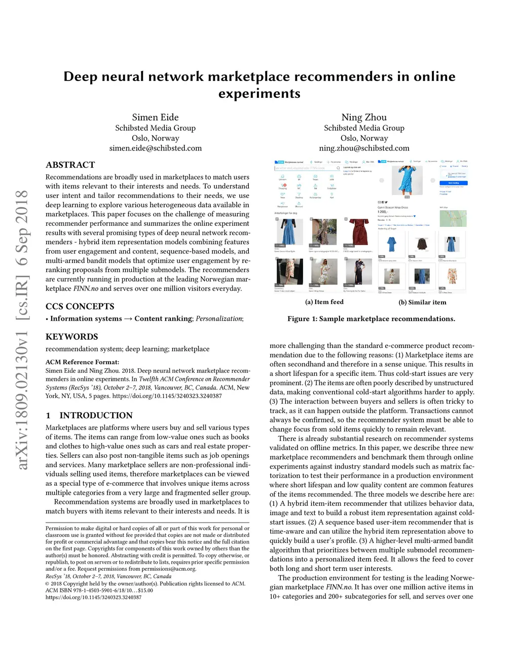 Recommendations are broadly used in marketplaces to match users with items relevant to their interests and needs. To understand user intent and tailor recommendations to their needs, we use deep learning to explore various heterogeneous data available in marketplaces. This paper focuses on the challenge of measuring recommender performance and summarizes the online experiment results with several promising types of deep neural network recommenders - hybrid item representation models combining features from user engagement and content, sequence-based models, and multi-armed bandit models that optimize user engagement by re-ranking proposals from multiple submodels. The recommenders are currently running in production at the leading Norwegian marketplace FINN.no and serves over one million visitors everyday.