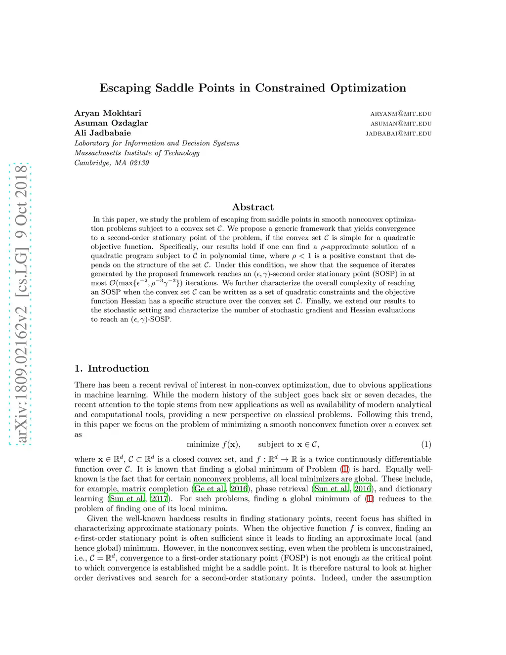 In this paper, we study the problem of escaping from saddle points in smooth nonconvex optimization problems subject to a convex set . We propose a generic framework that yields convergence to a second-order stationary point of the problem, if the convex set is simple for a quadratic objective function. Specifically, our results hold if one can find a -approximate solution of a quadratic program subject to in polynomial time, where is a positive constant that depends on the structure of the set . Under this condition, we show that the sequence of iterates generated by the proposed framework reaches an -second order stationary point (SOSP) in at most iterations. We further characterize the overall complexity of reaching an SOSP when the convex set can be written as a set of quadratic constraints and the objective function Hessian has a specific structure over the convex set . Finally, we extend our results to the stochastic setting and characterize the number of stochastic gradient and Hessian evaluations to reach an -SOSP.