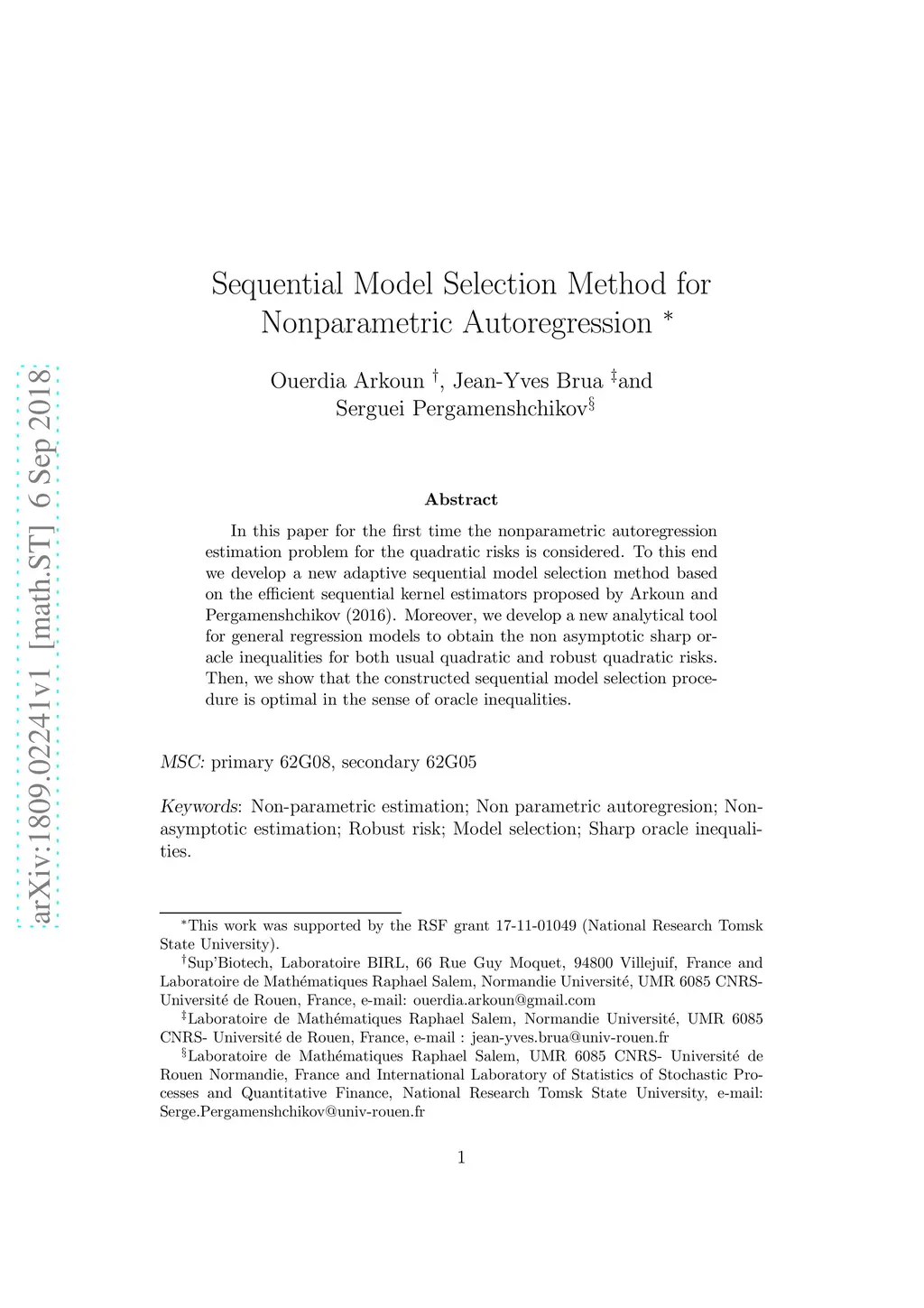 In this paper for the first time the nonparametric autoregression estimation problem for the quadratic risks is considered. To this end we develop a new adaptive sequential model selection method based on the efficient sequential kernel estimators proposed by Arkoun and Pergamenshchikov (2016). Moreover, we develop a new analytical tool for general regression models to obtain the non asymptotic sharp or- acle inequalities for both usual quadratic and robust quadratic risks. Then, we show that the constructed sequential model selection proce- dure is optimal in the sense of oracle inequalities.