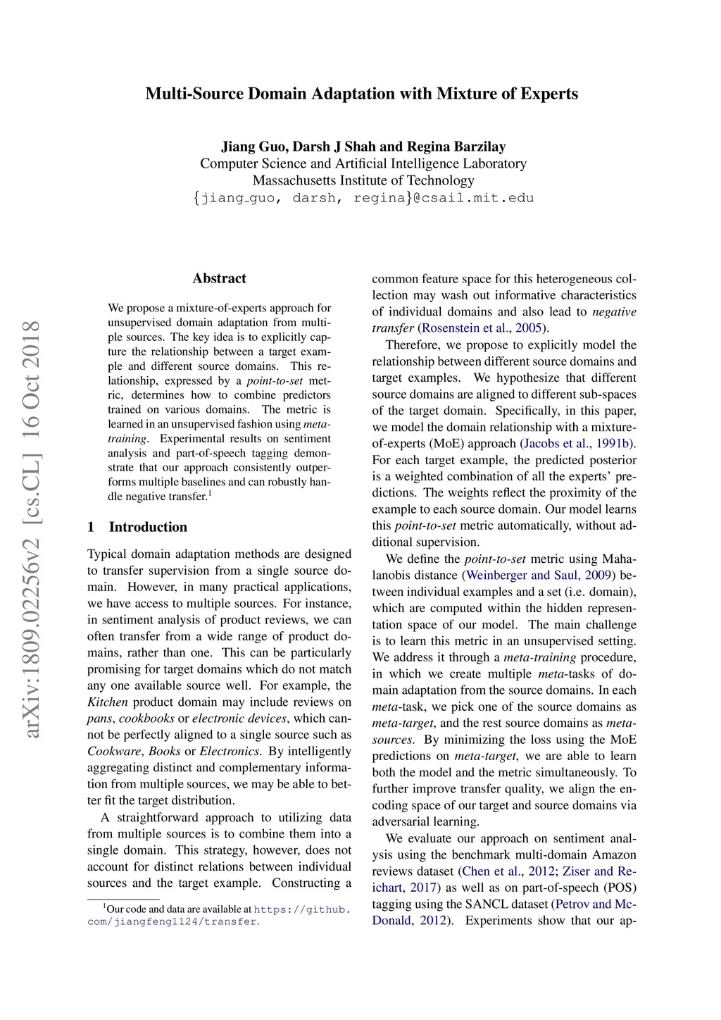 We propose a mixture-of-experts approach for unsupervised domain adaptation from multiple sources. The key idea is to explicitly capture the relationship between a target example and different source domains. This relationship, expressed by a point-to-set metric, determines how to combine predictors trained on various domains. The metric is learned in an unsupervised fashion using meta-training. Experimental results on sentiment analysis and part-of-speech tagging demonstrate that our approach consistently outperforms multiple baselines and can robustly handle negative transfer.