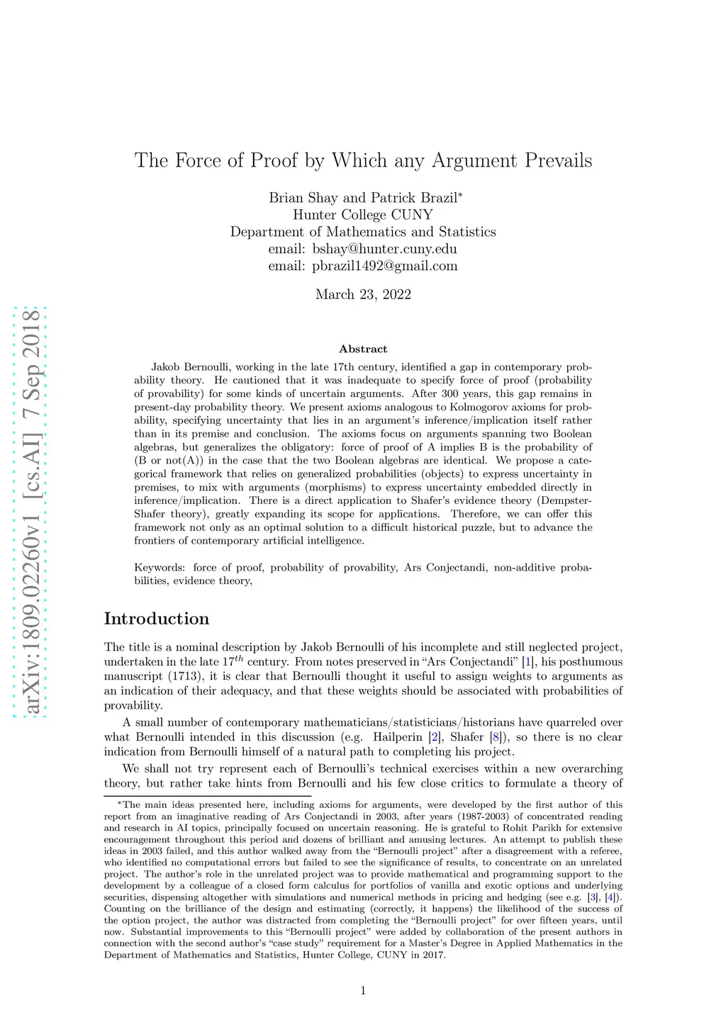 Jakob Bernoulli, working in the late 17th century, identified a gap in contemporary probability theory. He cautioned that it was inadequate to specify force of proof (probability of provability) for some kinds of uncertain arguments. After 300 years, this gap remains in present-day probability theory. We present axioms analogous to Kolmogorov's axioms for probability, specifying uncertainty that lies in an argument's inference/implication itself rather than in its premise and conclusion. The axioms focus on arguments spanning two Boolean algebras, but generalize the obligatory: "force of proof of A implies B is the probability of B or not A" in the case that the Boolean algebras are identical. We propose a categorical framework that relies on generalized probabilities (objects) to express uncertainty in premises, to mix with arguments (morphisms) to express uncertainty embedded directly in inference/implication. There is a direct application to Shafer's evidence theory (Dempster-Shafer theory), greatly expanding its scope for applications. Therefore, we can offer this framework not only as an optimal solution to a difficult historical puzzle, but also to advance the frontiers of contemporary artificial intelligence. Keywords: force of proof, probability of provability, Ars Conjectandi, non additive probabilities, evidence theory.
