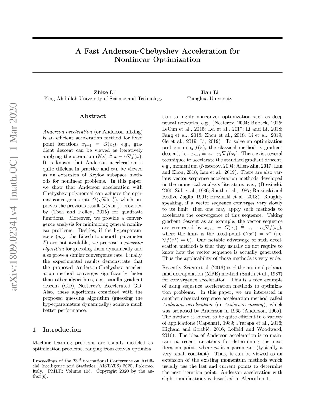 Anderson mixing (or Anderson acceleration) is an efficient acceleration method for fixed point iterations , e.g., gradient descent can be viewed as iteratively applying the operation . It is known that Anderson mixing is quite efficient in practice and can be viewed as an extension of Krylov subspace methods for nonlinear problems. In this paper, we show that Anderson mixing with Chebyshev polynomial parameters can achieve the optimal convergence rate , which improves the previous result provided by [Toth and Kelley, 2015] for quadratic functions. Then, we provide a convergence analysis for minimizing general nonlinear problems. Besides, if the hyperparameters (e.g., the Lipschitz smooth parameter ) are not available, we propose a guessing algorithm for guessing them dynamically and also prove a similar convergence rate. Finally, the experimental results demonstrate that the proposed Anderson-Chebyshev mixing method converges significantly faster than other algorithms, e.g., vanilla gradient descent (GD), Nesterov's Accelerated GD. Also, these algorithms combined with the proposed guessing algorithm (guessing the hyperparameters dynamically) achieve much better performance.