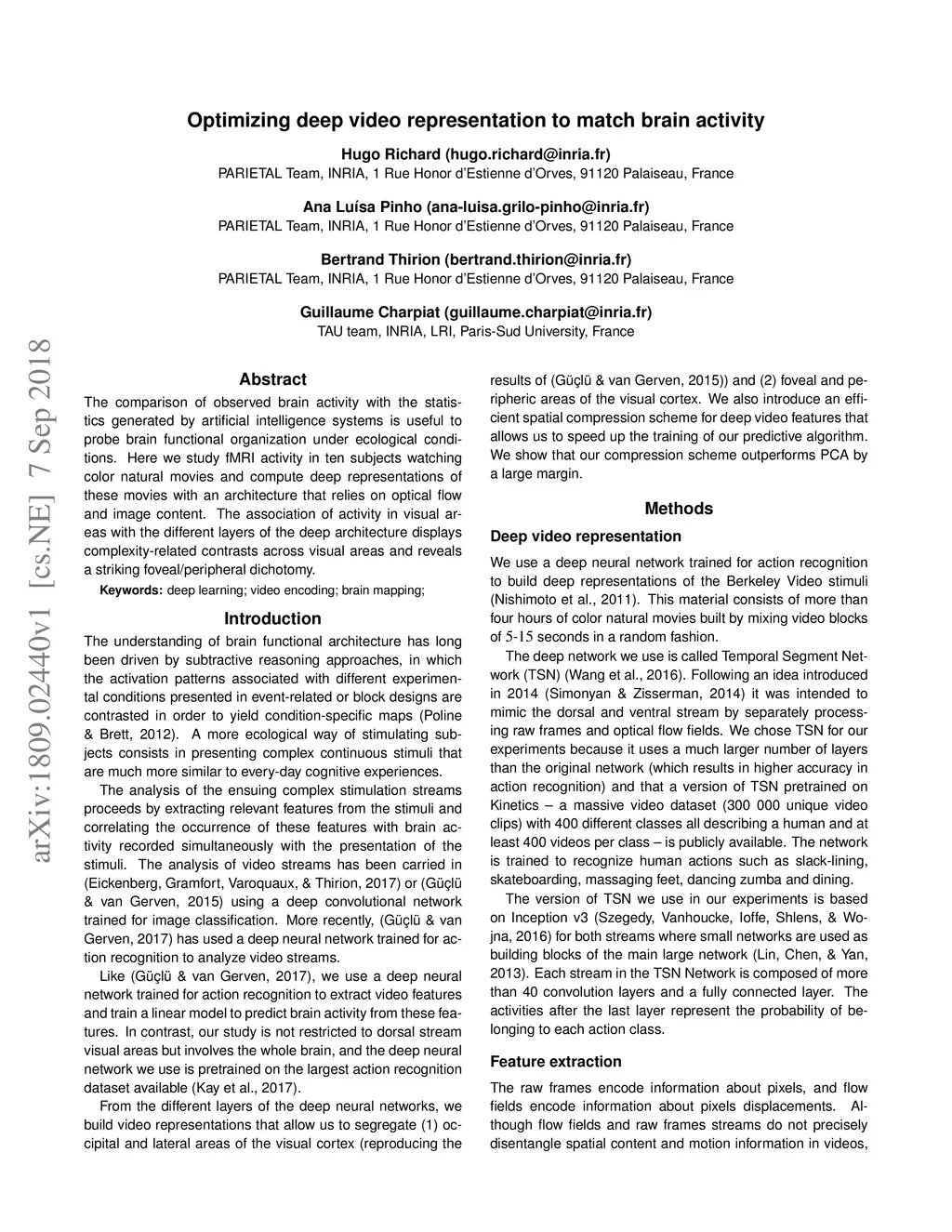 The comparison of observed brain activity with the statistics generated by artificial intelligence systems is useful to probe brain functional organization under ecological conditions. Here we study fMRI activity in ten subjects watching color natural movies and compute deep representations of these movies with an architecture that relies on optical flow and image content. The association of activity in visual areas with the different layers of the deep architecture displays complexity-related contrasts across visual areas and reveals a striking foveal/peripheral dichotomy.