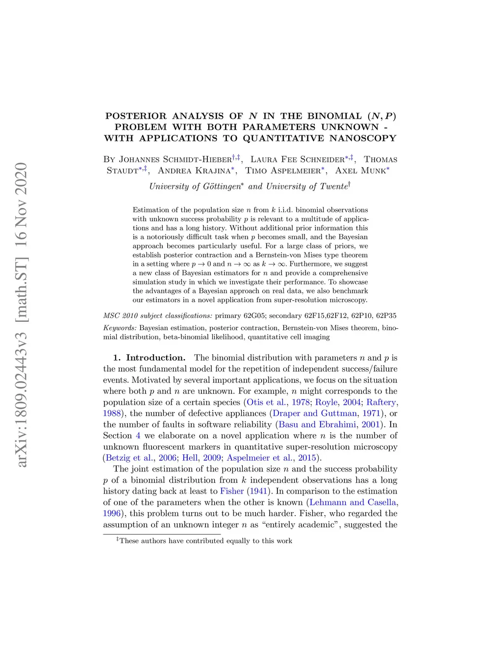 Estimation of the population size from i.i.d.\ binomial observations with unknown success probability is relevant to a multitude of applications and has a long history. Without additional prior information this is a notoriously difficult task when becomes small, and the Bayesian approach becomes particularly useful. For a large class of priors, we establish posterior contraction and a Bernstein-von Mises type theorem in a setting where and as . Furthermore, we suggest a new class of Bayesian estimators for and provide a comprehensive simulation study in which we investigate their performance. To showcase the advantages of a Bayesian approach on real data, we also benchmark our estimators in a novel application from super-resolution microscopy.