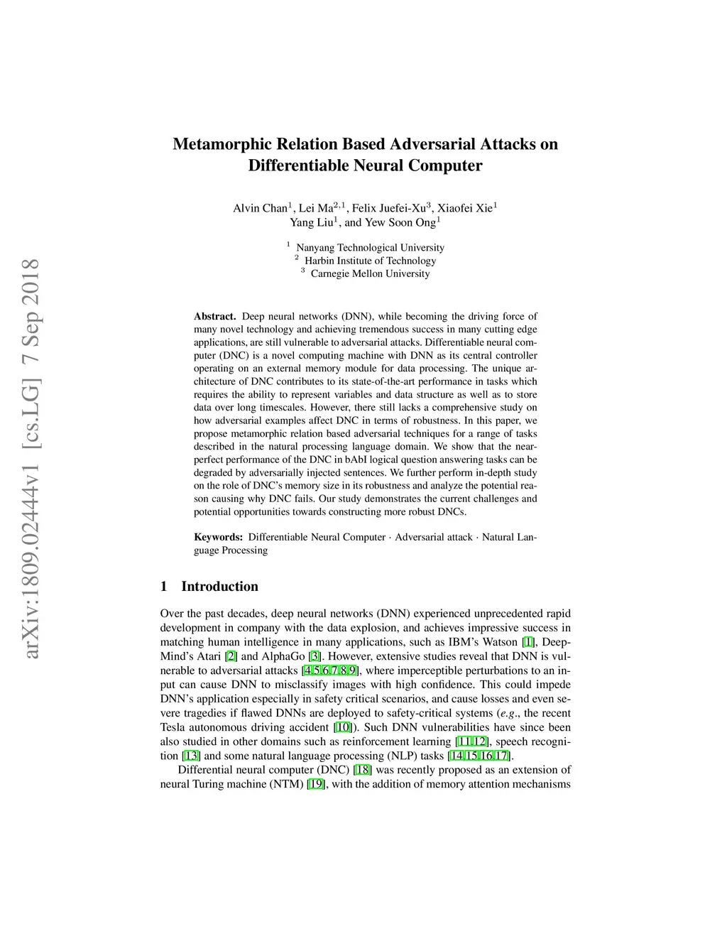 Deep neural networks (DNN), while becoming the driving force of many novel technology and achieving tremendous success in many cutting-edge applications, are still vulnerable to adversarial attacks. Differentiable neural computer (DNC) is a novel computing machine with DNN as its central controller operating on an external memory module for data processing. The unique architecture of DNC contributes to its state-of-the-art performance in tasks which requires the ability to represent variables and data structure as well as to store data over long timescales. However, there still lacks a comprehensive study on how adversarial examples affect DNC in terms of robustness. In this paper, we propose metamorphic relation based adversarial techniques for a range of tasks described in the natural processing language domain. We show that the near-perfect performance of the DNC in bAbI logical question answering tasks can be degraded by adversarially injected sentences. We further perform in-depth study on the role of DNC's memory size in its robustness and analyze the potential reason causing why DNC fails. Our study demonstrates the current challenges and potential opportunities towards constructing more robust DNCs.