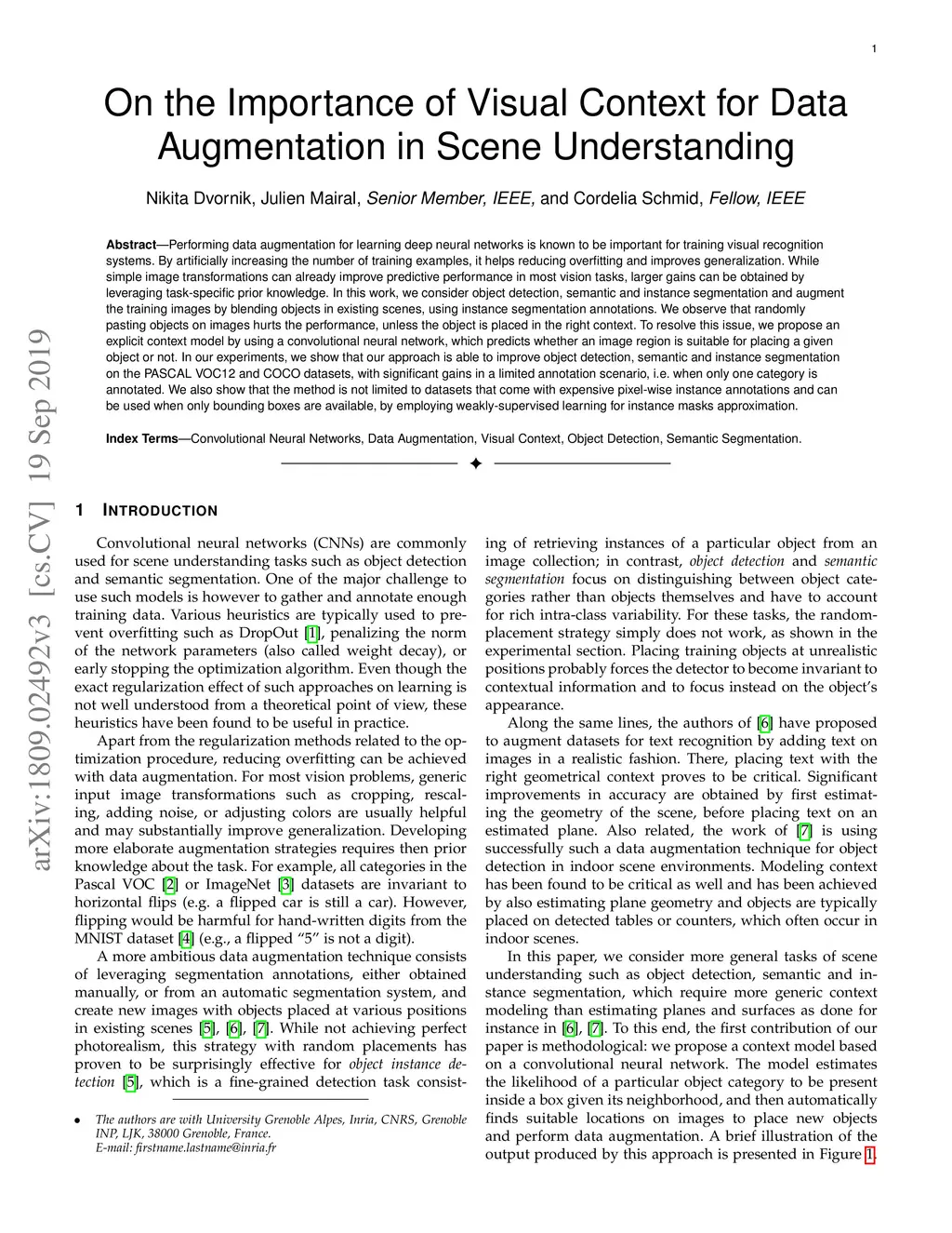 Performing data augmentation for learning deep neural networks is known to be important for training visual recognition systems. By artificially increasing the number of training examples, it helps reducing overfitting and improves generalization. While simple image transformations can already improve predictive performance in most vision tasks, larger gains can be obtained by leveraging task-specific prior knowledge. In this work, we consider object detection, semantic and instance segmentation and augment the training images by blending objects in existing scenes, using instance segmentation annotations. We observe that randomly pasting objects on images hurts the performance, unless the object is placed in the right context. To resolve this issue, we propose an explicit context model by using a convolutional neural network, which predicts whether an image region is suitable for placing a given object or not. In our experiments, we show that our approach is able to improve object detection, semantic and instance segmentation on the PASCAL VOC12 and COCO datasets, with significant gains in a limited annotation scenario, i.e. when only one category is annotated. We also show that the method is not limited to datasets that come with expensive pixel-wise instance annotations and can be used when only bounding boxes are available, by employing weakly-supervised learning for instance masks approximation.