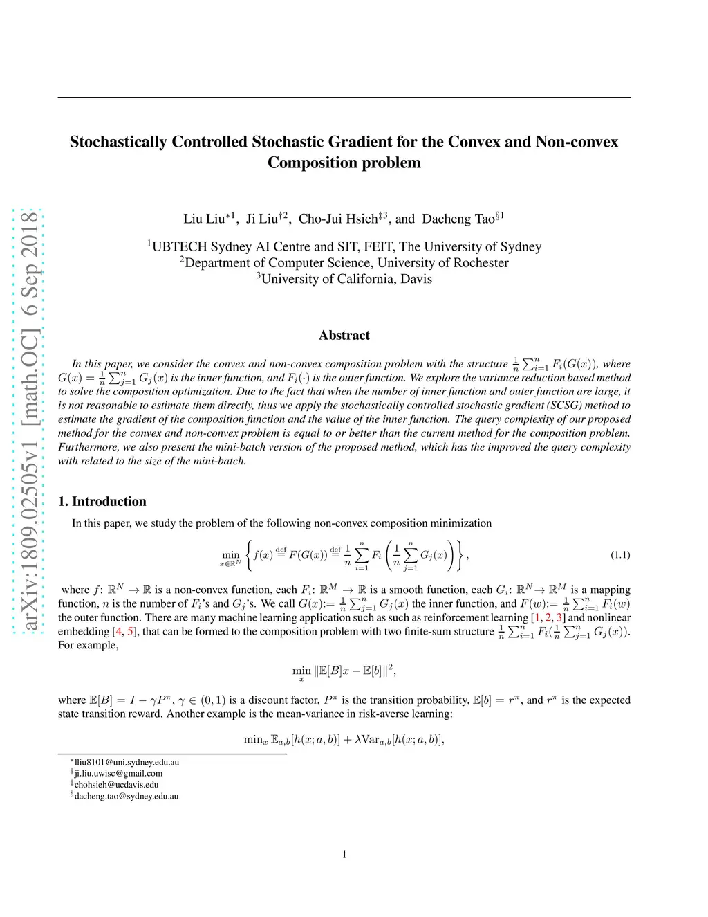 In this paper, we consider the convex and non-convex composition problem with the structure , where $G( x )=\frac{1}{n}\sum\nolimits_{j = 1}^n {{G_j}( x )} $ is the inner function, and is the outer function. We explore the variance reduction based method to solve the composition optimization. Due to the fact that when the number of inner function and outer function are large, it is not reasonable to estimate them directly, thus we apply the stochastically controlled stochastic gradient (SCSG) method to estimate the gradient of the composition function and the value of the inner function. The query complexity of our proposed method for the convex and non-convex problem is equal to or better than the current method for the composition problem. Furthermore, we also present the mini-batch version of the proposed method, which has the improved the query complexity with related to the size of the mini-batch.