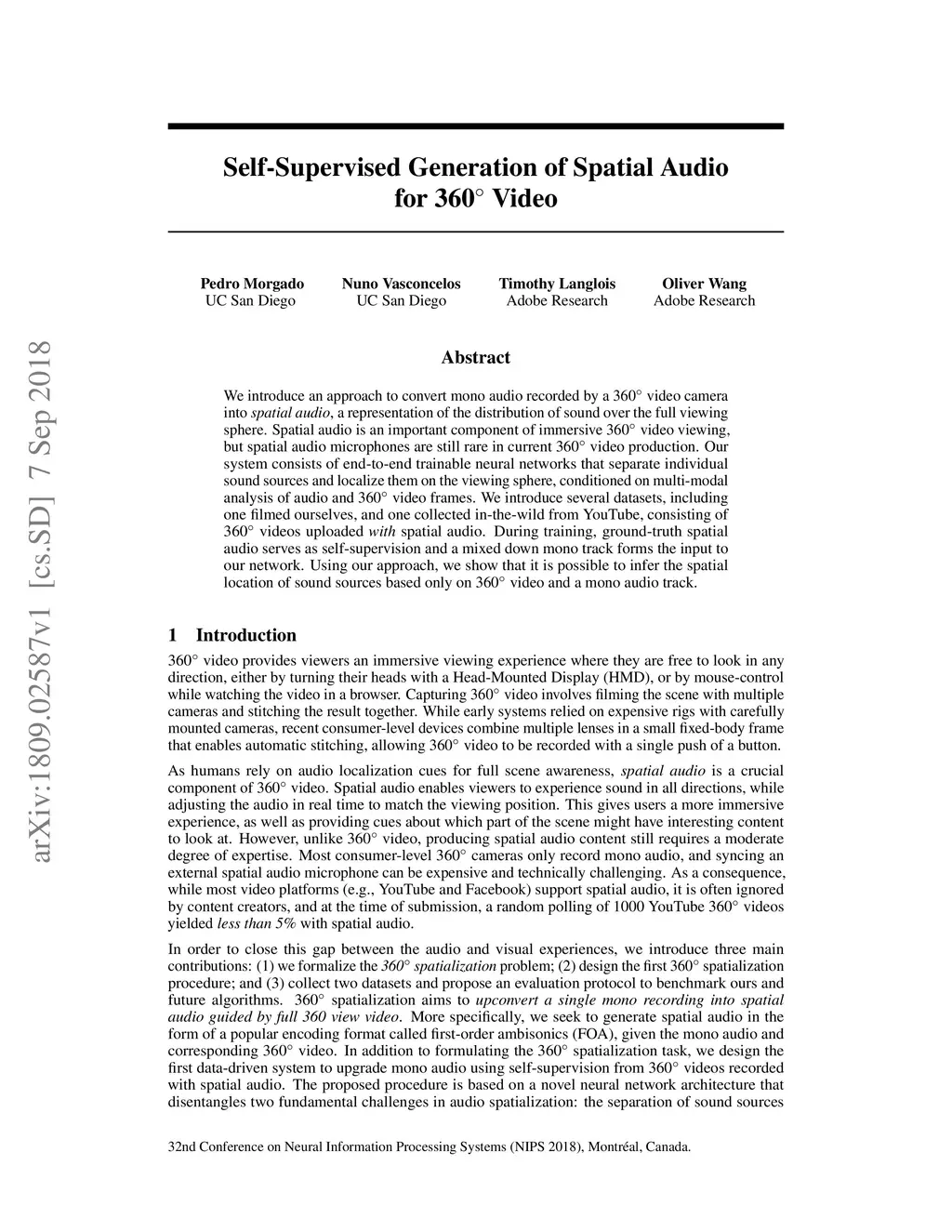 We introduce an approach to convert mono audio recorded by a 360 video camera into spatial audio, a representation of the distribution of sound over the full viewing sphere. Spatial audio is an important component of immersive 360 video viewing, but spatial audio microphones are still rare in current 360 video production. Our system consists of end-to-end trainable neural networks that separate individual sound sources and localize them on the viewing sphere, conditioned on multi-modal analysis of audio and 360 video frames. We introduce several datasets, including one filmed ourselves, and one collected in-the-wild from YouTube, consisting of 360 videos uploaded with spatial audio. During training, ground-truth spatial audio serves as self-supervision and a mixed down mono track forms the input to our network. Using our approach, we show that it is possible to infer the spatial location of sound sources based only on 360 video and a mono audio track.