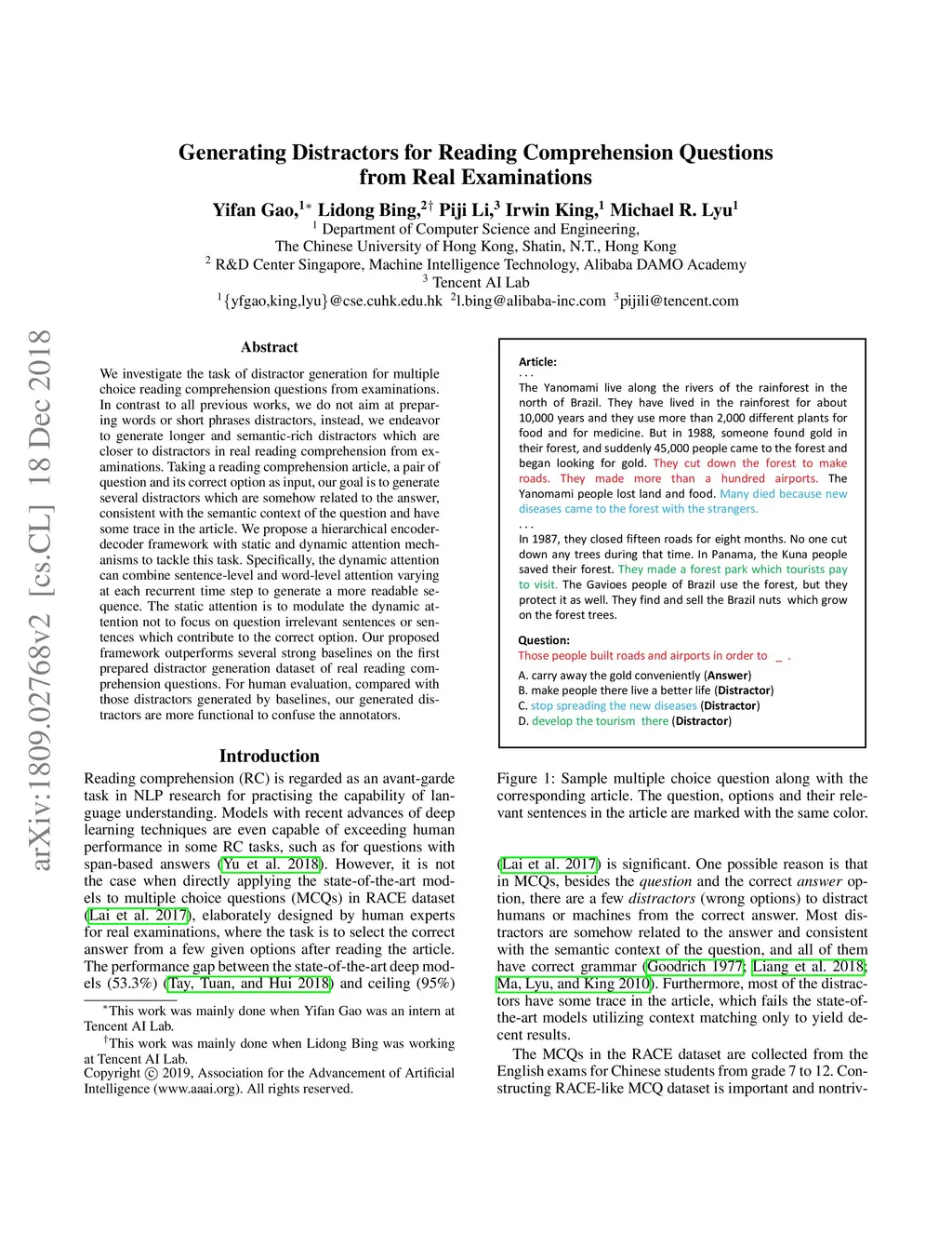 Generating Distractors for Reading Comprehension Questions from Real