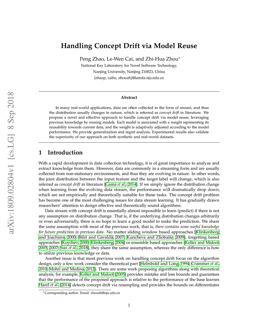 In many real-world applications, data are often collected in the form of stream, and thus the distribution usually changes in nature, which is referred as concept drift in literature. We propose a novel and effective approach to handle concept drift via model reuse, leveraging previous knowledge by reusing models. Each model is associated with a weight representing its reusability towards current data, and the weight is adaptively adjusted according to the model performance. We provide generalization and regret analysis. Experimental results also validate the superiority of our approach on both synthetic and real-world datasets.