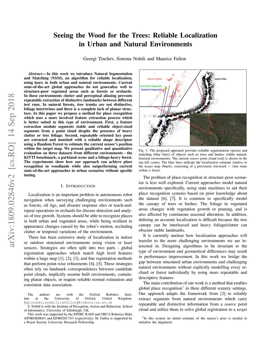 In this work we introduce Natural Segmentation and Matching (NSM), an algorithm for reliable localization, using laser, in both urban and natural environments. Current state-of-the-art global approaches do not generalize well to structure-poor vegetated areas such as forests or orchards. In these environments clutter and perceptual aliasing prevents repeatable extraction of distinctive landmarks between different test runs. In natural forests, tree trunks are not distinctive, foliage intertwines and there is a complete lack of planar structure. In this paper we propose a method for place recognition which uses a more involved feature extraction process which is better suited to this type of environment. First, a feature extraction module segments stable and reliable object-sized segments from a point cloud despite the presence of heavy clutter or tree foliage. Second, repeatable oriented key poses are extracted and matched with a reliable shape descriptor using a Random Forest to estimate the current sensor's position within the target map. We present qualitative and quantitative evaluation on three datasets from different environments - the KITTI benchmark, a parkland scene and a foliage-heavy forest. The experiments show how our approach can achieve place recognition in woodlands while also outperforming current state-of-the-art approaches in urban scenarios without specific tuning.