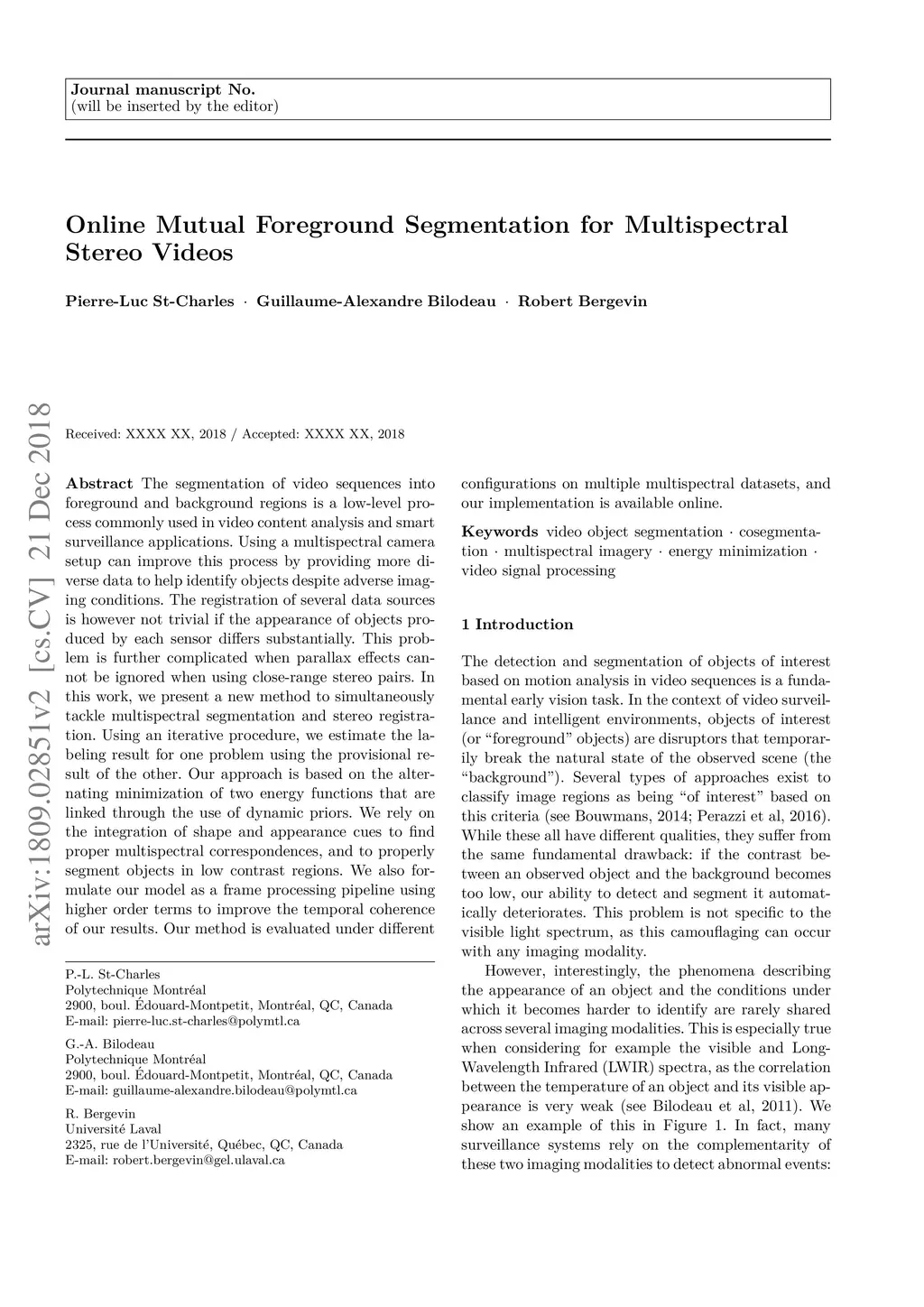 Online Mutual Foreground Segmentation for Multispectral Stereo Videos