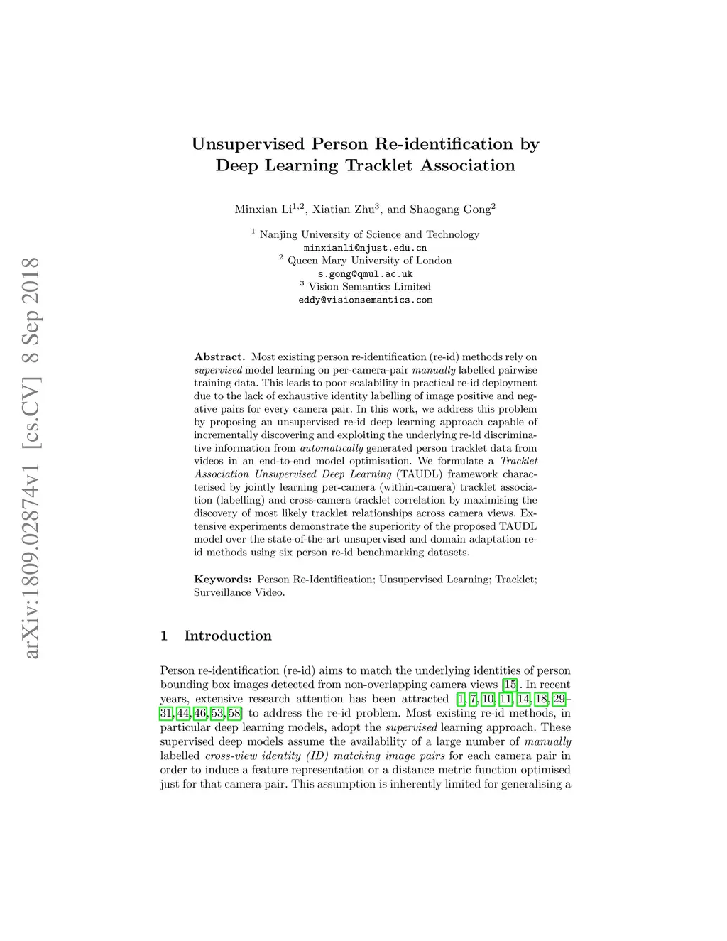 Mostexistingpersonre-identification(re-id)methods relyon supervised model learning on per-camera-pair manually labelled pairwise training data. This leads to poor scalability in practical re-id deployment due to the lack of exhaustive identity labelling of image positive and negative pairs for every camera pair. In this work, we address this problem by proposing an unsupervised re-id deep learning approach capable of incrementally discovering and exploiting the underlying re-id discriminative information from automatically generated person tracklet data from videos in an end-to-end model optimisation. We formulate a Tracklet Association Unsupervised Deep Learning (TAUDL) framework characterised by jointly learning per-camera (within-camera) tracklet association (labelling) and cross-camera tracklet correlation by maximising the discovery of most likely tracklet relationships across camera views. Extensive experiments demonstrate the superiority of the proposed TAUDL model over the state-of-the-art unsupervised and domain adaptation re- id methods using six person re-id benchmarking datasets.