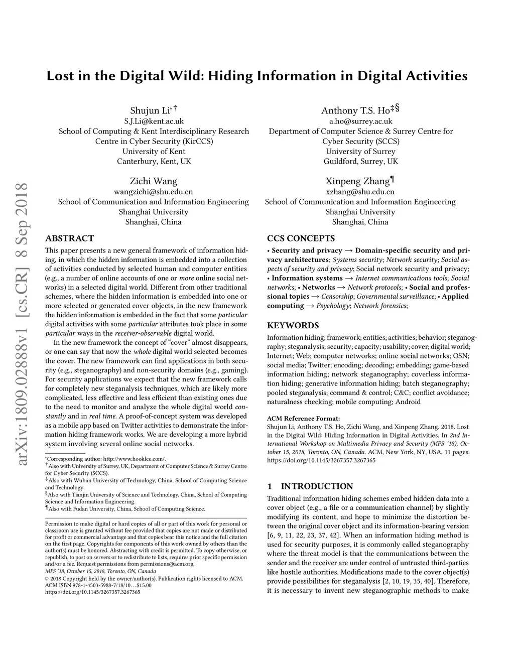 This paper presents a new general framework of information hiding, in which the hidden information is embedded into a collection of activities conducted by selected human and computer entities (e.g., a number of online accounts of one or more online social networks) in a selected digital world. Different from other traditional schemes, where the hidden information is embedded into one or more selected or generated cover objects, in the new framework the hidden information is embedded in the fact that some particular digital activities with some particular attributes took place in some particular ways in the receiver-observable digital world. In the new framework the concept of "cover" almost disappears, or one can say that now the whole digital world selected becomes the cover. The new framework can find applications in both security (e.g., steganography) and non-security domains (e.g., gaming). For security applications we expect that the new framework calls for completely new steganalysis techniques, which are likely more complicated, less effective and less efficient than existing ones due to the need to monitor and analyze the whole digital world constantly and in real time. A proof-of-concept system was developed as a mobile app based on Twitter activities to demonstrate the information hiding framework works. We are developing a more hybrid system involving several online social networks.