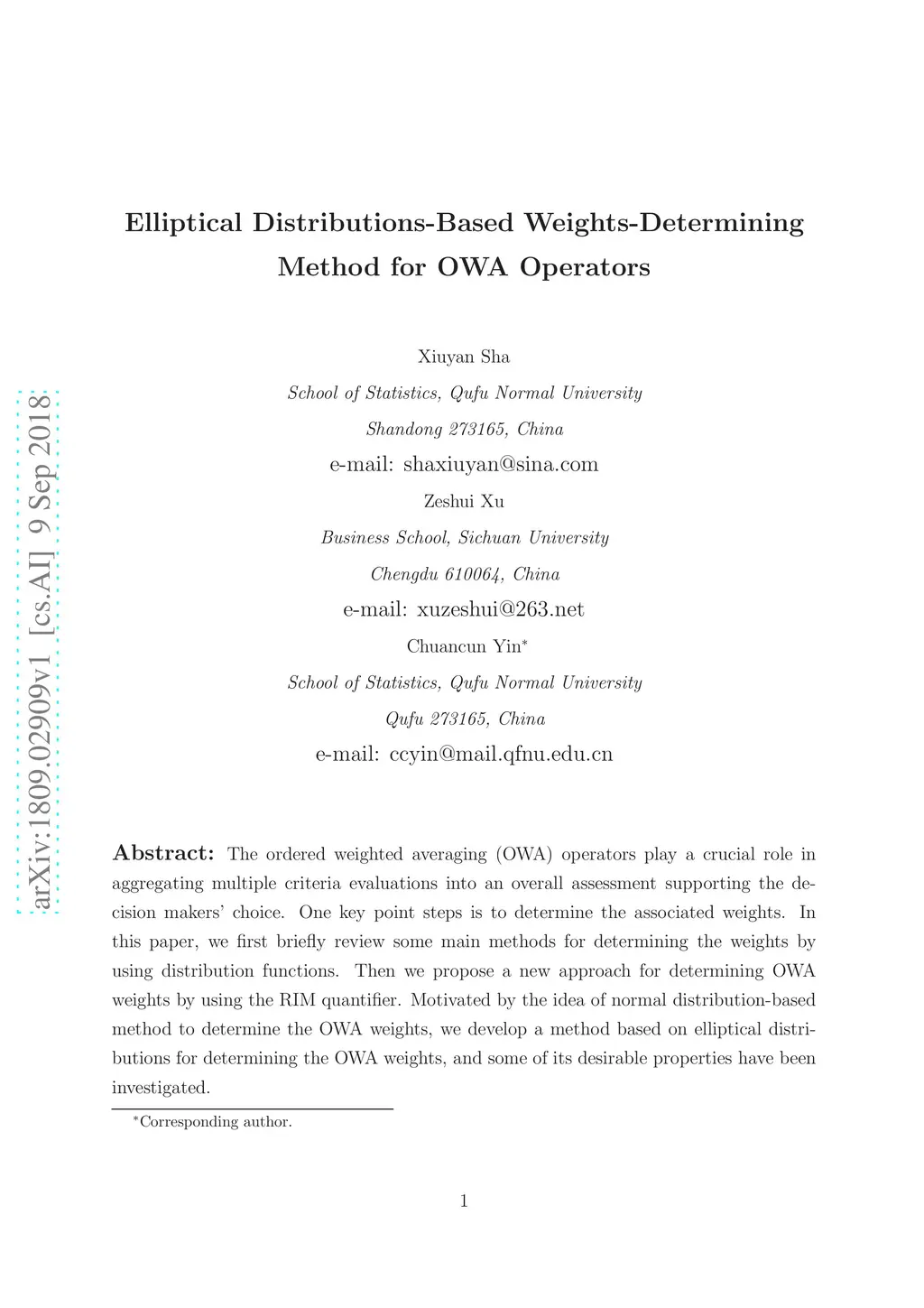 Elliptical Distributions-Based Weights-Determining Method for OWA