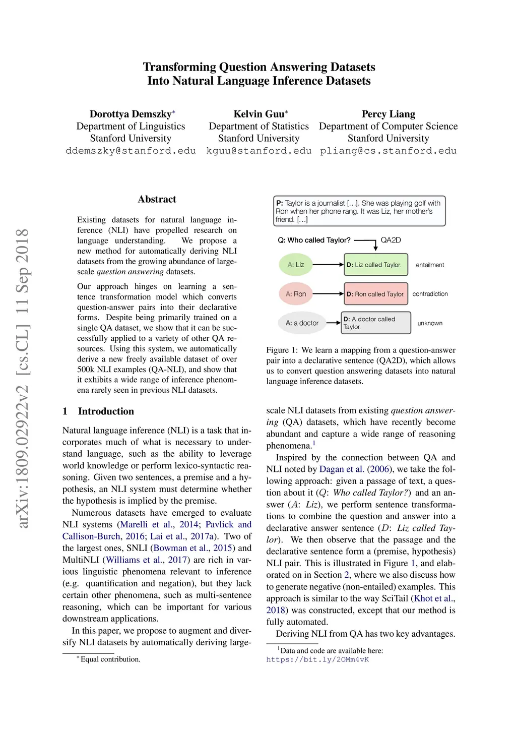 Existing datasets for natural language inference (NLI) have propelled research on language understanding. We propose a new method for automatically deriving NLI datasets from the growing abundance of large-scale question answering datasets. Our approach hinges on learning a sentence transformation model which converts question-answer pairs into their declarative forms. Despite being primarily trained on a single QA dataset, we show that it can be successfully applied to a variety of other QA resources. Using this system, we automatically derive a new freely available dataset of over 500k NLI examples (QA-NLI), and show that it exhibits a wide range of inference phenomena rarely seen in previous NLI datasets.
