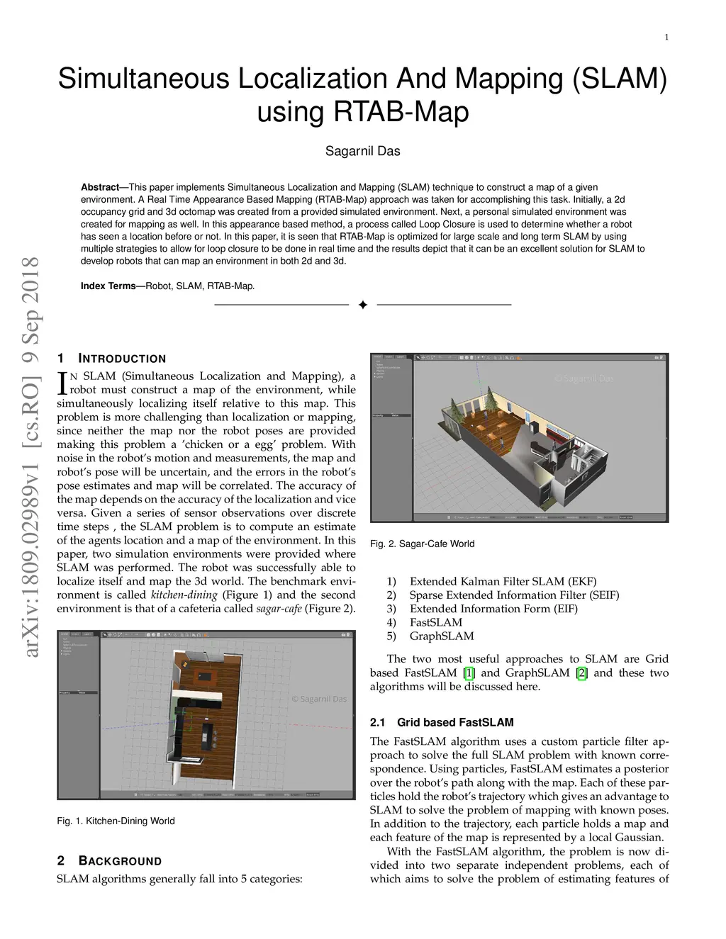 This paper implements Simultaneous Localization and Mapping (SLAM) technique to construct a map of a given environment. A Real Time Appearance Based Mapping (RTAB-Map) approach was taken for accomplishing this task. Initially, a 2d occupancy grid and 3d octomap was created from a provided simulated environment. Next, a personal simulated environment was created for mapping as well. In this appearance based method, a process called Loop Closure is used to determine whether a robot has seen a location before or not. In this paper, it is seen that RTAB-Map is optimized for large scale and long term SLAM by using multiple strategies to allow for loop closure to be done in real time and the results depict that it can be an excellent solution for SLAM to develop robots that can map an environment in both 2d and 3d.