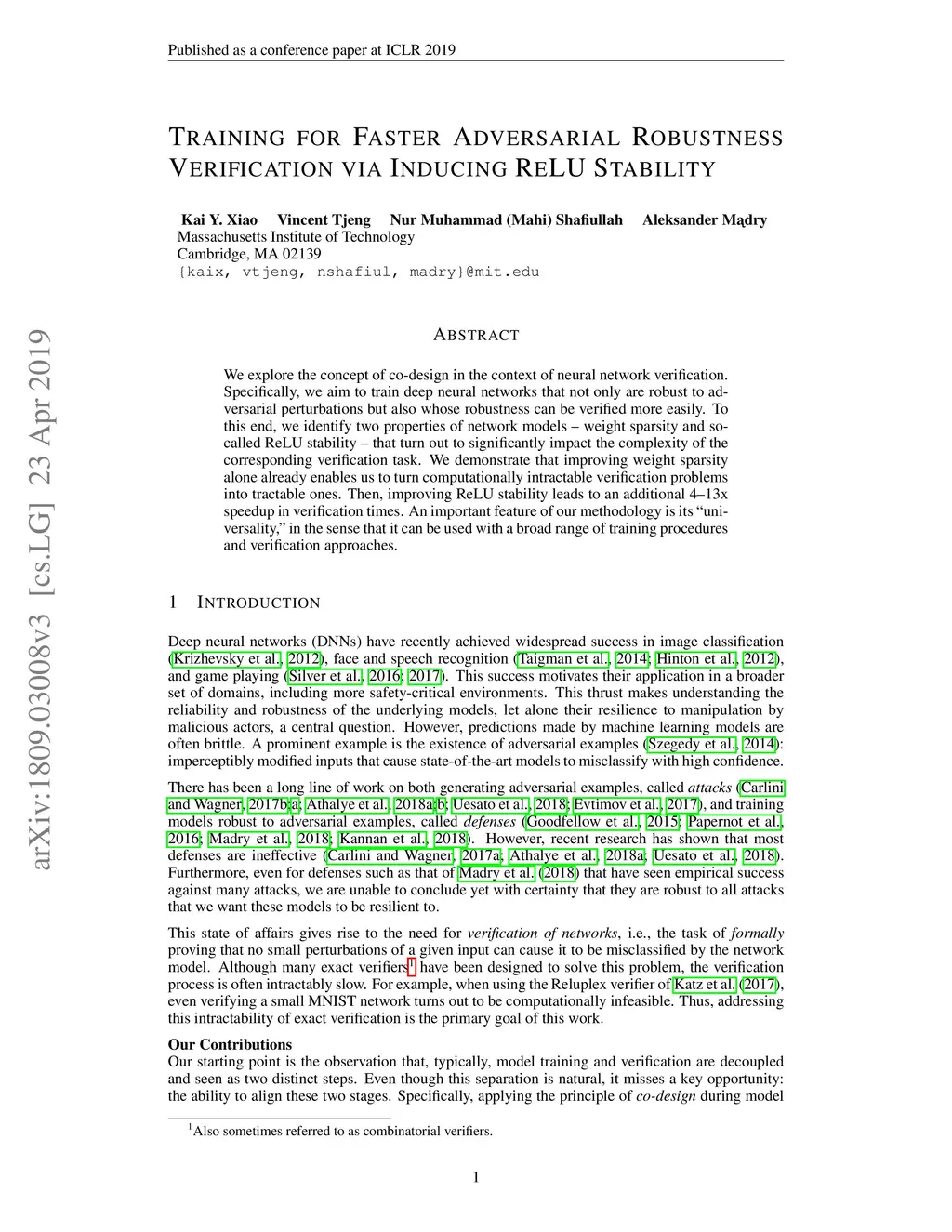 We explore the concept of co-design in the context of neural network verification. Specifically, we aim to train deep neural networks that not only are robust to adversarial perturbations but also whose robustness can be verified more easily. To this end, we identify two properties of network models - weight sparsity and so-called ReLU stability - that turn out to significantly impact the complexity of the corresponding verification task. We demonstrate that improving weight sparsity alone already enables us to turn computationally intractable verification problems into tractable ones. Then, improving ReLU stability leads to an additional 4-13x speedup in verification times. An important feature of our methodology is its "universality," in the sense that it can be used with a broad range of training procedures and verification approaches.