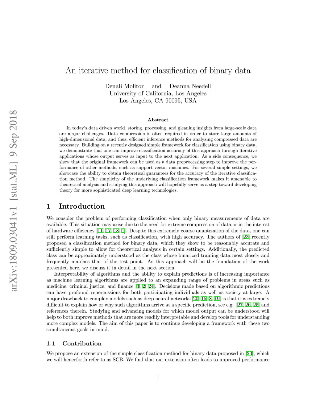 In today's data driven world, storing, processing, and gleaning insights from large-scale data are major challenges. Data compression is often required in order to store large amounts of high-dimensional data, and thus, efficient inference methods for analyzing compressed data are necessary. Building on a recently designed simple framework for classification using binary data, we demonstrate that one can improve classification accuracy of this approach through iterative applications whose output serves as input to the next application. As a side consequence, we show that the original framework can be used as a data preprocessing step to improve the performance of other methods, such as support vector machines. For several simple settings, we showcase the ability to obtain theoretical guarantees for the accuracy of the iterative classification method. The simplicity of the underlying classification framework makes it amenable to theoretical analysis and studying this approach will hopefully serve as a step toward developing theory for more sophisticated deep learning technologies.