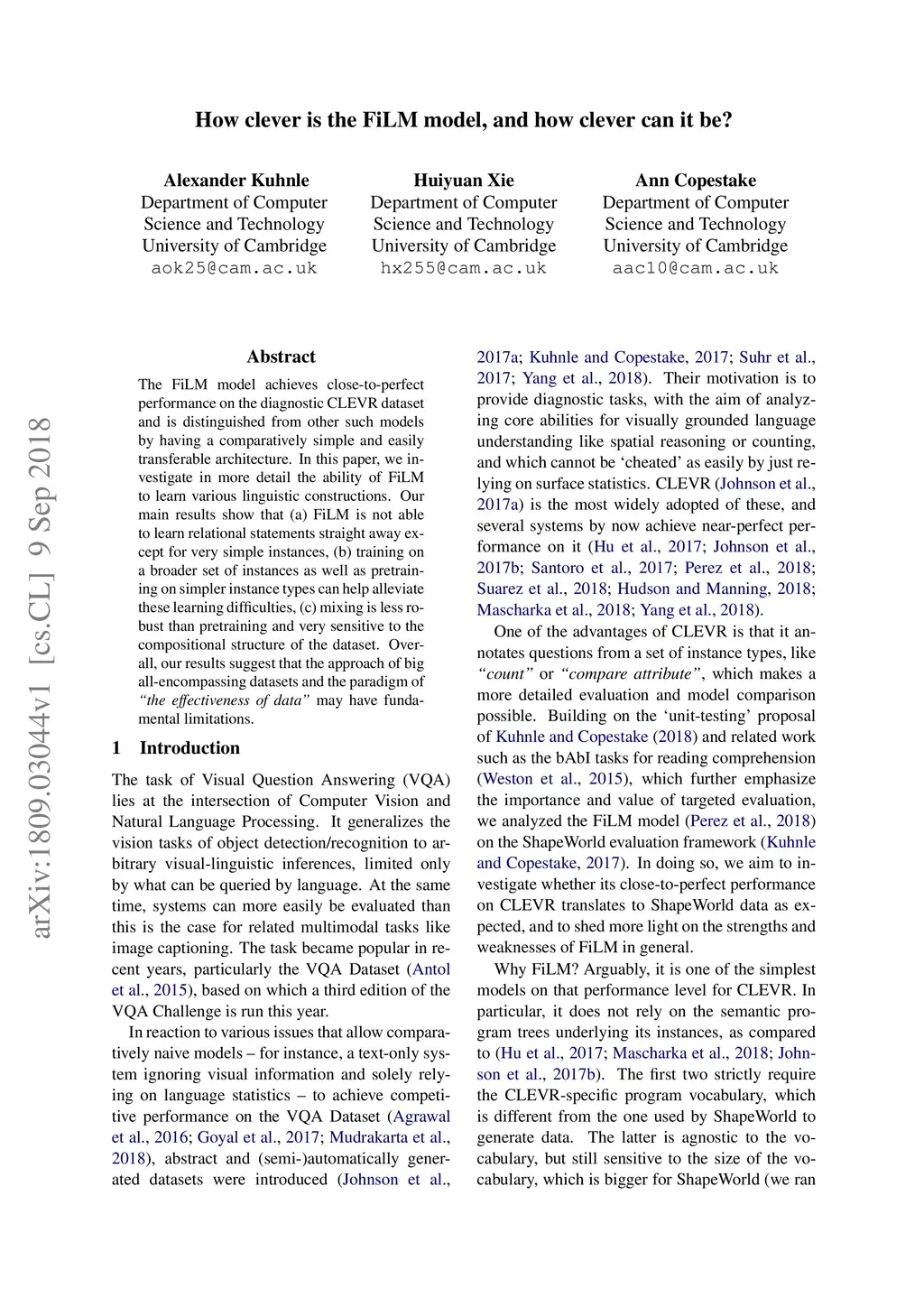 The FiLM model achieves close-to-perfect performance on the diagnostic CLEVR dataset and is distinguished from other such models by having a comparatively simple and easily transferable architecture. In this paper, we investigate in more detail the ability of FiLM to learn various linguistic constructions. Our main results show that (a) FiLM is not able to learn relational statements straight away except for very simple instances, (b) training on a broader set of instances as well as pretraining on simpler instance types can help alleviate these learning difficulties, (c) mixing is less robust than pretraining and very sensitive to the compositional structure of the dataset. Overall, our results suggest that the approach of big all-encompassing datasets and the paradigm of "the effectiveness of data" may have fundamental limitations.