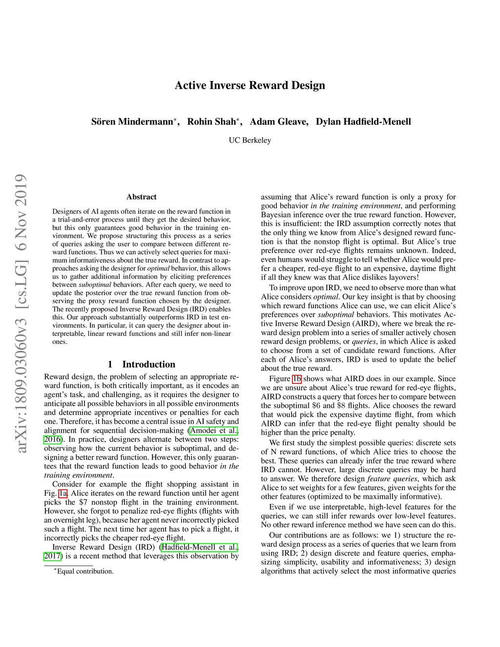 Designers of AI agents often iterate on the reward function in a trial-and-error process until they get the desired behavior, but this only guarantees good behavior in the training environment. We propose structuring this process as a series of queries asking the user to compare between different reward functions. Thus we can actively select queries for maximum informativeness about the true reward. In contrast to approaches asking the designer for optimal behavior, this allows us to gather additional information by eliciting preferences between suboptimal behaviors. After each query, we need to update the posterior over the true reward function from observing the proxy reward function chosen by the designer. The recently proposed Inverse Reward Design (IRD) enables this. Our approach substantially outperforms IRD in test environments. In particular, it can query the designer about interpretable, linear reward functions and still infer non-linear ones.