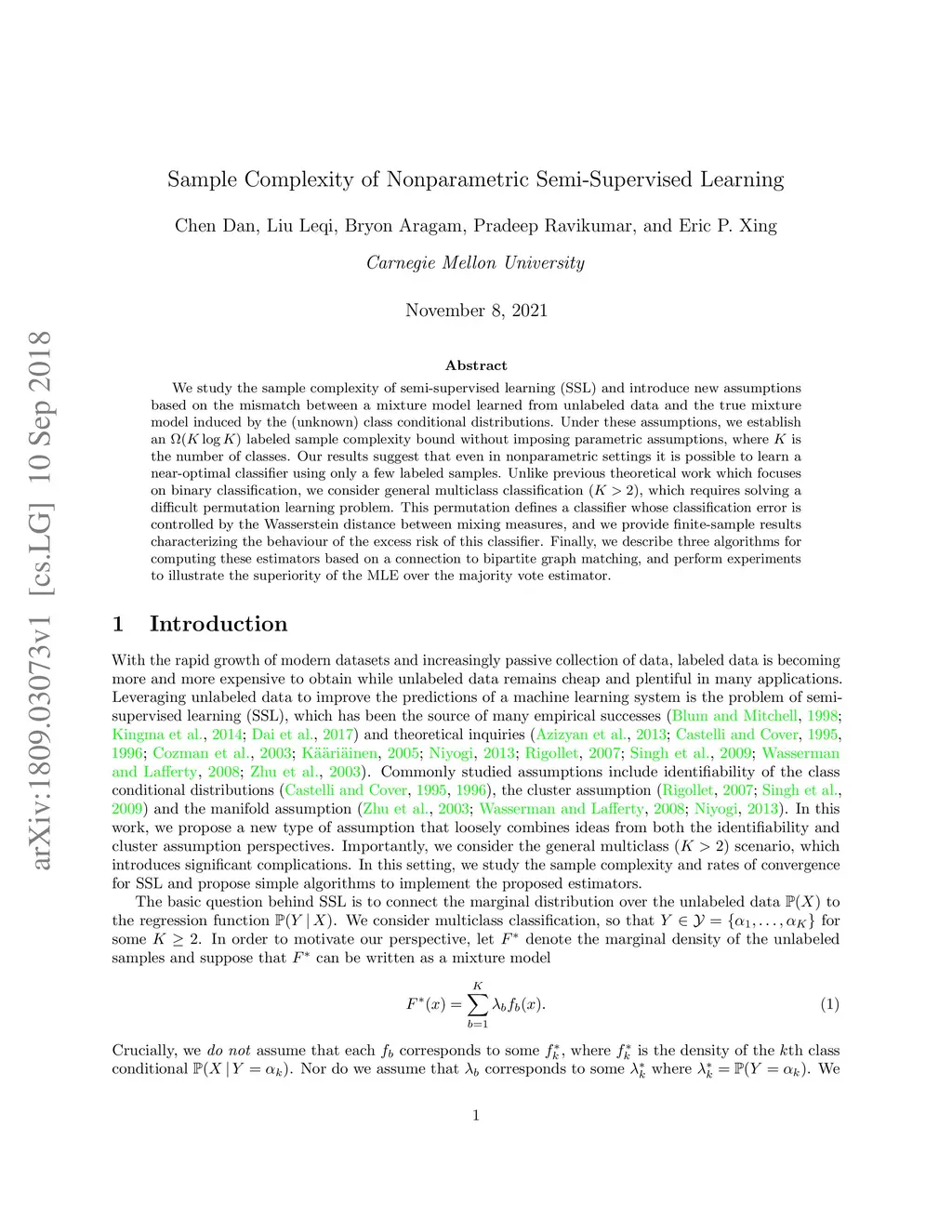 We study the sample complexity of semi-supervised learning (SSL) and introduce new assumptions based on the mismatch between a mixture model learned from unlabeled data and the true mixture model induced by the (unknown) class conditional distributions. Under these assumptions, we establish an labeled sample complexity bound without imposing parametric assumptions, where is the number of classes. Our results suggest that even in nonparametric settings it is possible to learn a near-optimal classifier using only a few labeled samples. Unlike previous theoretical work which focuses on binary classification, we consider general multiclass classification (), which requires solving a difficult permutation learning problem. This permutation defines a classifier whose classification error is controlled by the Wasserstein distance between mixing measures, and we provide finite-sample results characterizing the behaviour of the excess risk of this classifier. Finally, we describe three algorithms for computing these estimators based on a connection to bipartite graph matching, and perform experiments to illustrate the superiority of the MLE over the majority vote estimator.