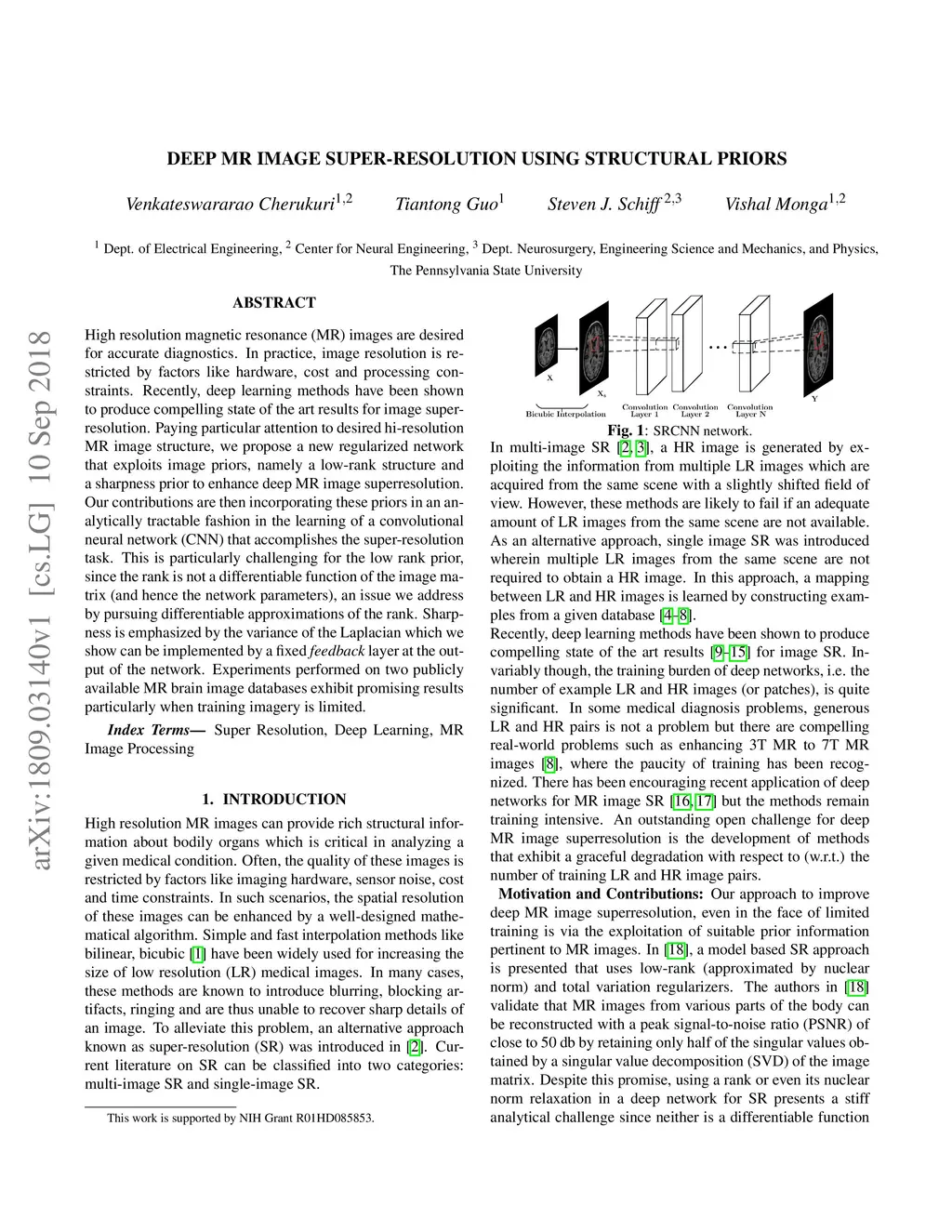 High resolution magnetic resonance (MR) images are desired for accurate diagnostics. In practice, image resolution is restricted by factors like hardware, cost and processing constraints. Recently, deep learning methods have been shown to produce compelling state of the art results for image super-resolution. Paying particular attention to desired hi-resolution MR image structure, we propose a new regularized network that exploits image priors, namely a low-rank structure and a sharpness prior to enhance deep MR image superresolution. Our contributions are then incorporating these priors in an analytically tractable fashion in the learning of a convolutional neural network (CNN) that accomplishes the super-resolution task. This is particularly challenging for the low rank prior, since the rank is not a differentiable function of the image matrix (and hence the network parameters), an issue we address by pursuing differentiable approximations of the rank. Sharpness is emphasized by the variance of the Laplacian which we show can be implemented by a fixed {\em feedback} layer at the output of the network. Experiments performed on two publicly available MR brain image databases exhibit promising results particularly when training imagery is limited.