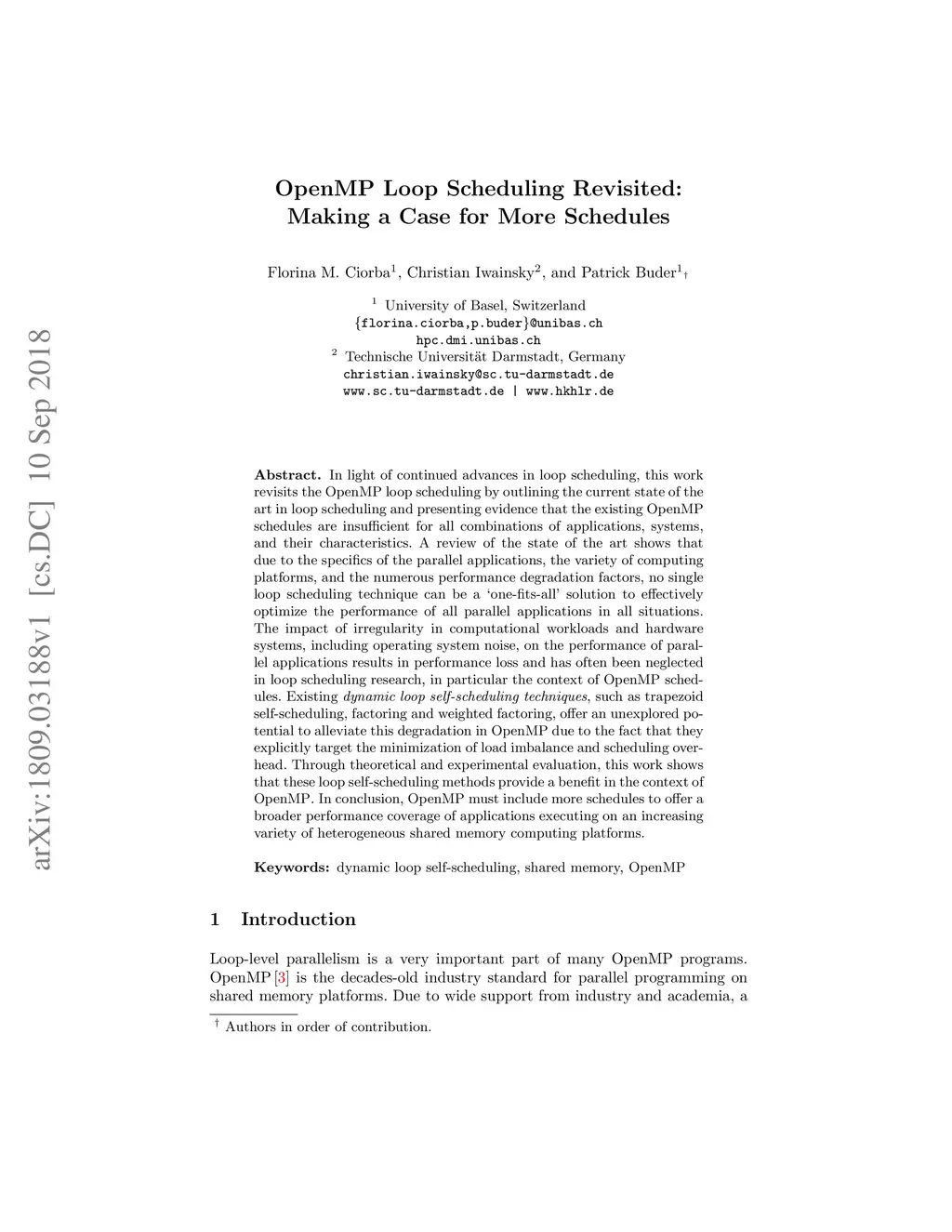 In light of continued advances in loop scheduling, this work revisits the OpenMP loop scheduling by outlining the current state of the art in loop scheduling and presenting evidence that the existing OpenMP schedules are insufficient for all combinations of applications, systems, and their characteristics. A review of the state of the art shows that due to the specifics of the parallel applications, the variety of computing platforms, and the numerous performance degradation factors, no single loop scheduling technique can be a óne-fits-all' solution to effectively optimize the performance of all parallel applications in all situations. The impact of irregularity in computational workloads and hardware systems, including operating system noise, on the performance of parallel applications, results in performance loss and has often been neglected in loop scheduling research, in particular, the context of OpenMP schedules. Existing dynamic loop self-scheduling techniques, such as trapezoid self-scheduling, factoring, and weighted factoring, offer an unexplored potential to alleviate this degradation in OpenMP due to the fact that they explicitly target the minimization of load imbalance and scheduling overhead. Through theoretical and experimental evaluation, this work shows that these loop self-scheduling methods provide a benefit in the context of OpenMP. In conclusion, OpenMP must include more schedules to offer a broader performance coverage of applications executing on an increasing variety of heterogeneous shared memory computing platforms.