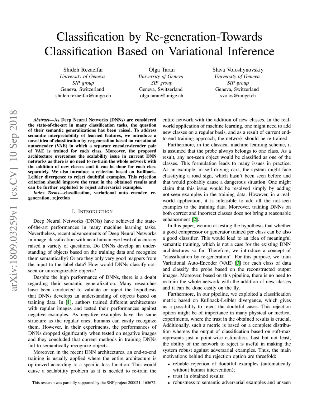 As Deep Neural Networks (DNNs) are considered the state-of-the-art in many classification tasks, the question of their semantic generalizations has been raised. To address semantic interpretability of learned features, we introduce a novel idea of classification by re-generation based on variational autoencoder (VAE) in which a separate encoder-decoder pair of VAE is trained for each class. Moreover, the proposed architecture overcomes the scalability issue in current DNN networks as there is no need to re-train the whole network with the addition of new classes and it can be done for each class separately. We also introduce a criterion based on Kullback-Leibler divergence to reject doubtful examples. This rejection criterion should improve the trust in the obtained results and can be further exploited to reject adversarial examples.