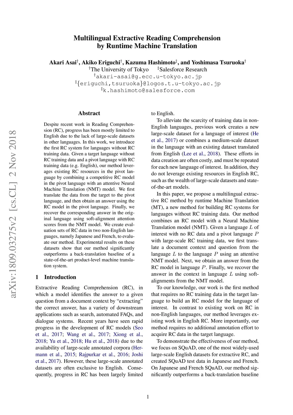 Multilingual Extractive Reading Comprehension by Runtime Machine