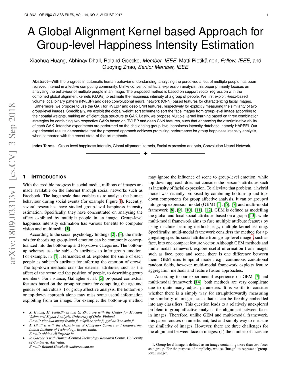 A Global Alignment Kernel based Approach for Group-level Happiness