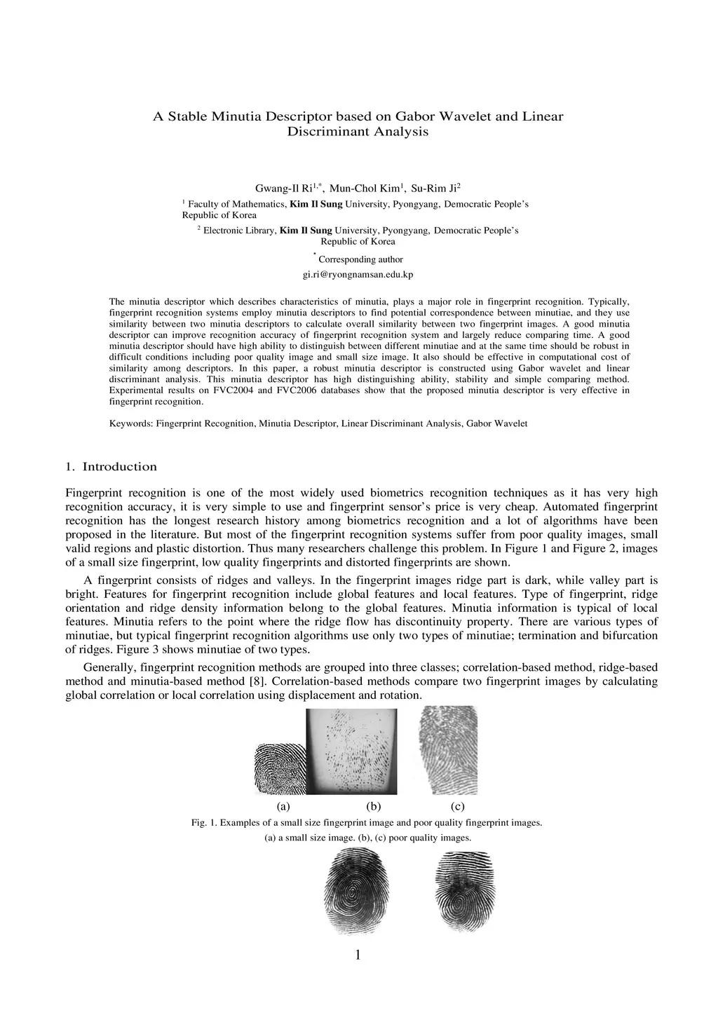 A Stable Minutia Descriptor based on Gabor Wavelet and Linear